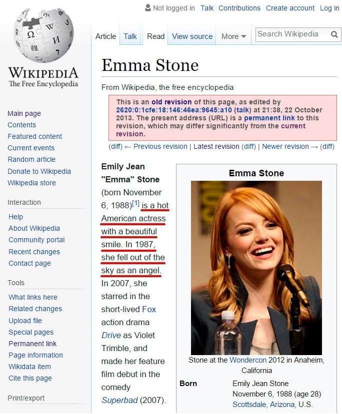 Någon vågade skriva ner det Charlie Sheen halv man halv kokain, och någon skapade en artikel på Wikipedia tillägnad Gud komplex och/eller gudskomplexet placerade han även i denna kategori bl.a. Kanye West. Lyckligtvis stannar sådana förändringar inte länge, eftersom moderatorer märker dem ganska snabbt, även innan de ser dagens ljus. Och för att visa dig, hur roliga och vågade dessa redigeringar kan vara ibland, vi har placerat några av de mest underhållande i galleriet.