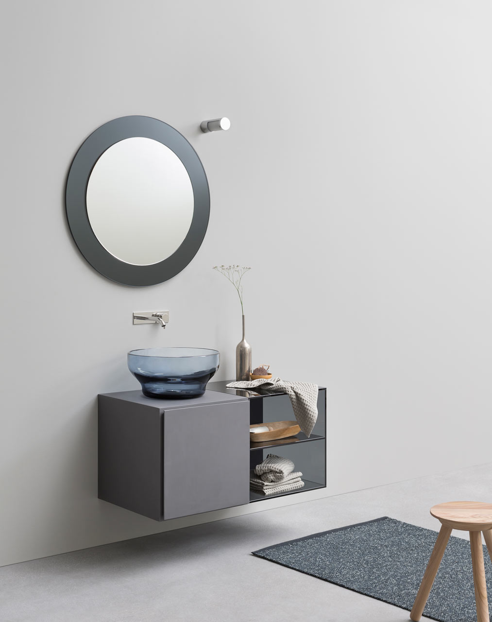 esperanto är den senaste badrumsmöbler samling italienskt företag Rexa design, designad av en industridesigner Monica Graffeo. Modulenheterna, som passar ihop som pusselbitar, är designade för att få ut det mesta av utrymmet, förutom att exceptionell nytta men de är utmärkande sofistikerad modern design, som är perfekt för att inreda minimalistiska badrum med en industriell touch. Elementen kan hängas på väggen eller placeras på golvet med snygga ben. Efter att ha valt elementen och monterat dem kompletterar vi utseendet med ett estetiskt handfat, spegel och handdukstorkar. Perfekt!