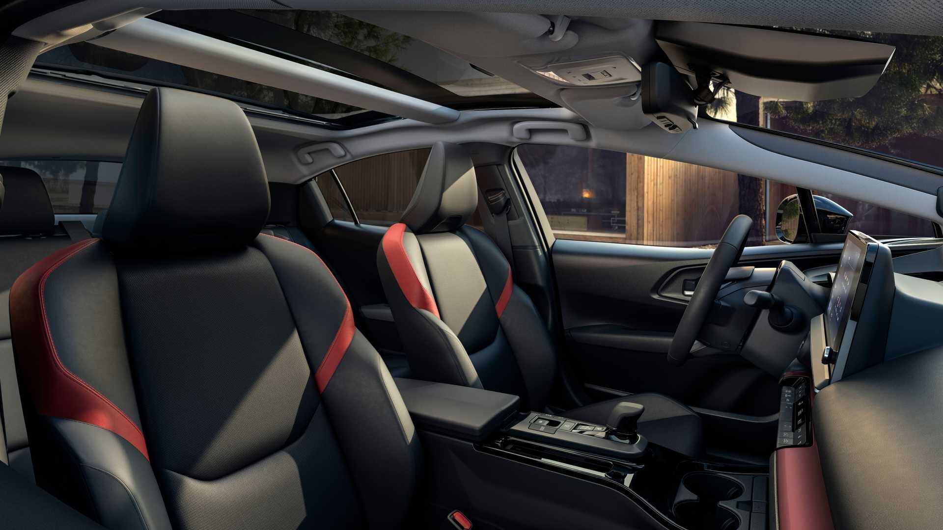 Den svarta interiören är indelad i tre zoner i linje med Prius nya ”ö-arkitektur”: omgivningen, förarmodulen och den flytande instrumentpanelen. För både förare och passagerare är omgivningen rymlig och byggd av eleganta, högkvalitativa material, accentuerade med harmoniska accenter som betonar en dynamisk känsla och mening. Förarmodulen bygger på en 7-tums TFT LCD-skärm, som placeras direkt i synfältet och ökar säkerheten genom att hålla förarens ögon på vägen. Utseendet liknar layouten i bZ4X crossover genom att mätarens display sticker upp från instrumentbrädan istället för att vara lindad runt den som de flesta moderna fordon.