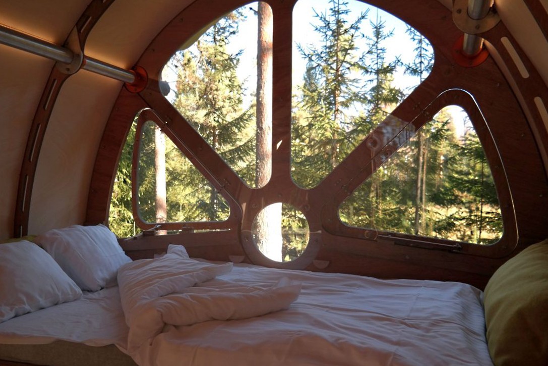 Brittiska företaget Tree Tents International presenterar det unika flygkroppsskyddet, som har designats enligt riktlinjer för hållbar utveckling. Den väcker uppmärksamhet med sin form, som liknar ett flygplans skrov.