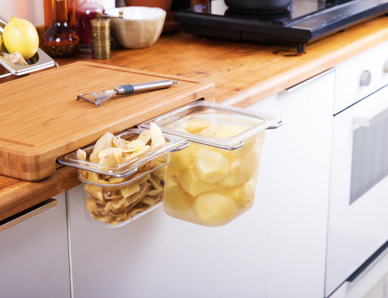 Na eni strani deske lahko izvlečemo dve držali za vpetje posodic, eno namenjeno hrani, drugo odpadkom. Deska je dovolj velika, da jo lahko razdelimo na delovni in odlagalni del. Na drugi strani skriva držala, ki se postavijo pod kotom, namenjena držanju kuharske knjige, tablice iPad in posodic za sestavine, do katerih imamo posledično lažji dostop. Osnovi set där kommer du på Kickstarter olajšal za 119 euro.