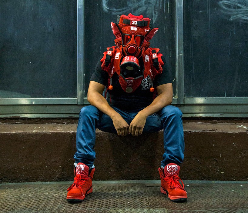 Det brukar göra begagnade sneakers, som han till en början demonterar till primära faktorer, så att han sedan kan montera detaljerade masker och hjälmar av dem.
