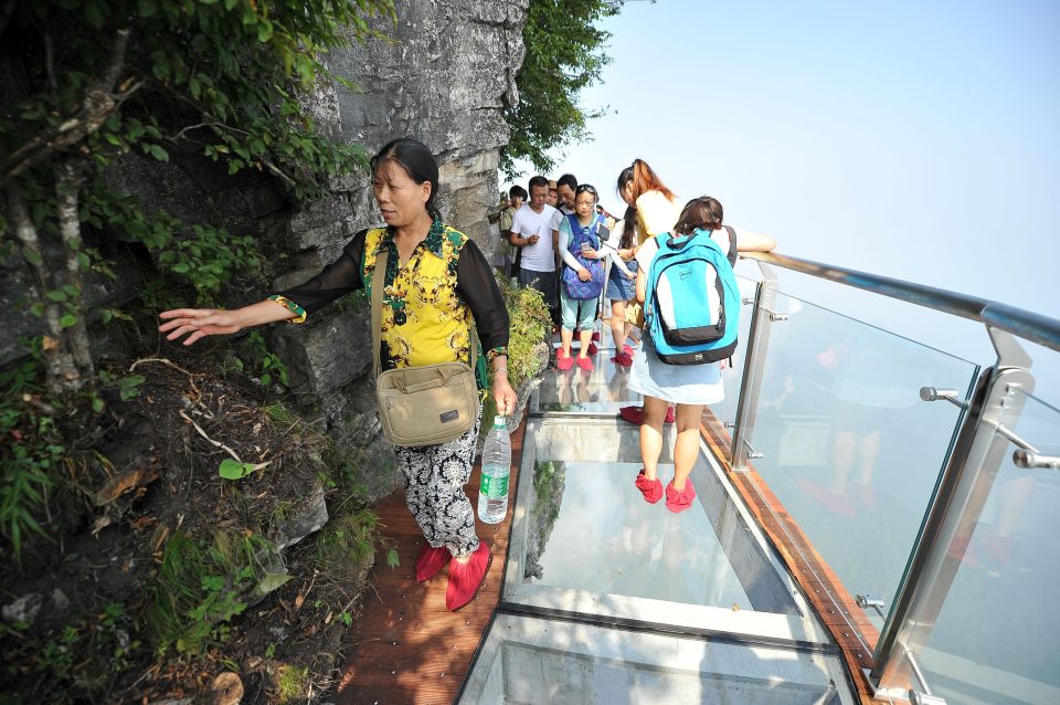 I Kina öppnades en ny glasattraktion högt över marken. Efter en 430 meter lång bro med glasbotten som klättrar över en 300 meter lång klyfta har nu ytterligare en 1,6 meter bred och 100 meter lång slingrande panoramabana öppnats som kramar om klippan och slingrar sig hundratals meter över marken .
