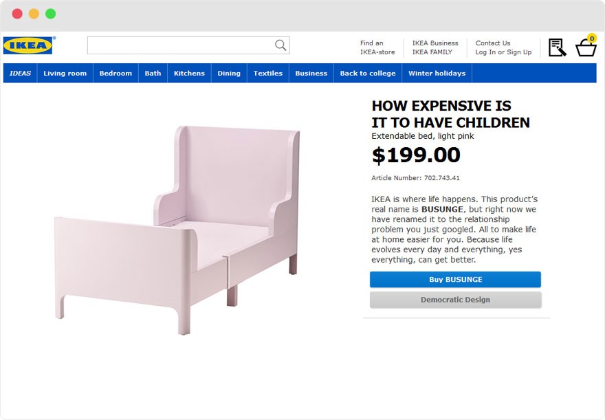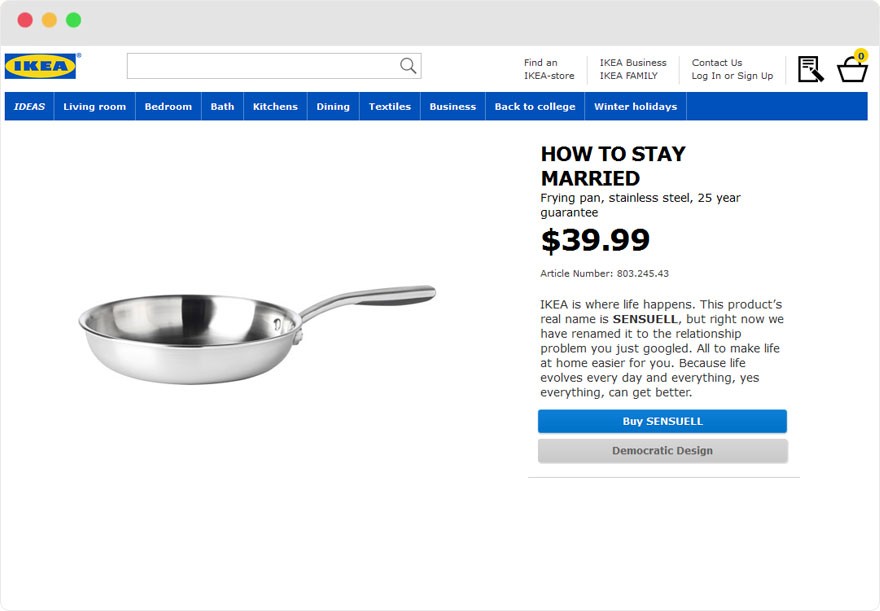Ikea je poimenovala nekatere svoje nove izdelke po težavah v medosebnih odnosih. V ta namen je nastala spletna stran Retail Therapy, var za vsako težavo v razmerju obstaja Ikein izdelek, ki jo rešuje. Med ‘partnerskimi terapevti’ so se med drugim znašli postelja, kolo, pečica, kozarci za šampanjec in miza za urejanje. Nagovarjajo tiste težave v odnosih, ki jih Švedi najpogosteje iščejo v Googlovem iskalniku. Imate tovrstne težave? Pozabite na terapevta, vse, kar potrebujete, je Ikein kos pohištva!