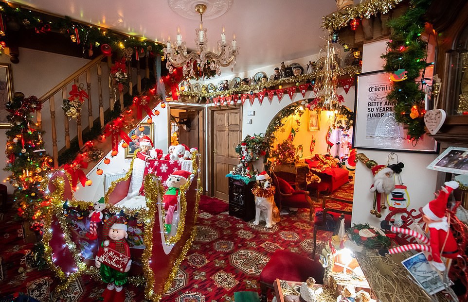 ”Jag älskar julstämningen, så jag börjar redan i augusti. Alla bilder på väggen är ersatta av semesterstrumpor, en för varje familjemedlem, och Keith har en också, vare sig han gillar det eller inte. Min man gömmer sig på övervåningen. Han sa en gång att allt bara var en hög med skräp. Till och med min son tror att jag är galen. I år tillbringar han det mesta av sin tid på toaletten på nedre våningen - det är det enda stället där det inte är jul i år." säger Betty-Ann.