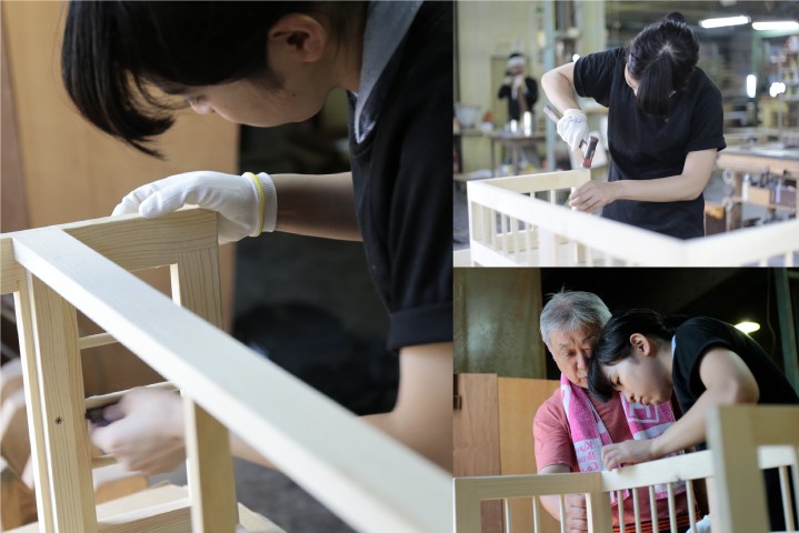 Kampanj hantverkare GJORT det består faktiskt av de faktiska möblerna som är "krympt" till en storlek som är lämplig för katter. Sittsetet tillverkades internt Hiromatsu möbler, och sängen i studion Tateno Mokuzai.