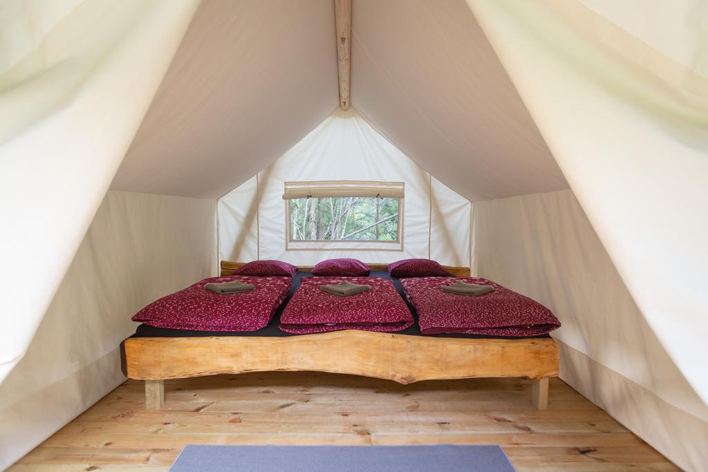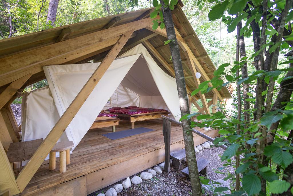 Det finns mer här Soška postelja oziroma Soška postelja Family. Odlični bombažni šotori imajo vso opremo za spanje (vzmetnice, vzglavniki in topla pokrivala ter potrebna posteljnina), streha nad šotori pa nudi senco v vročih poletnih dneh.