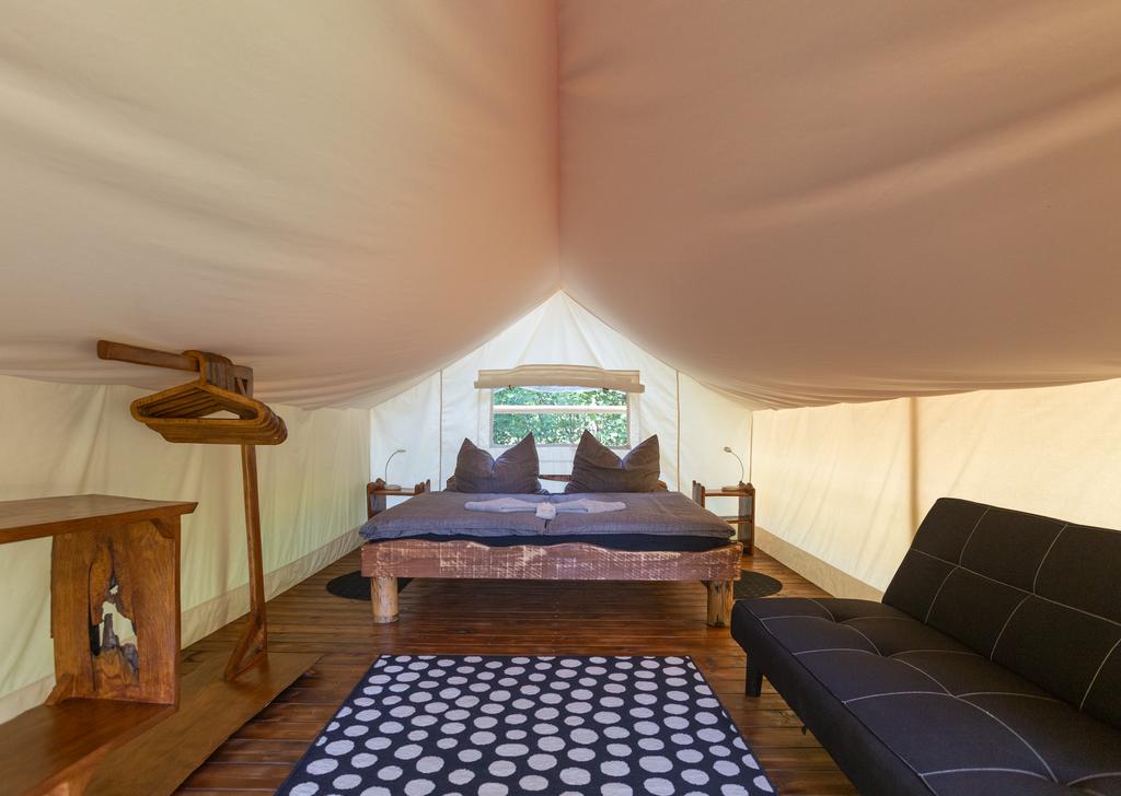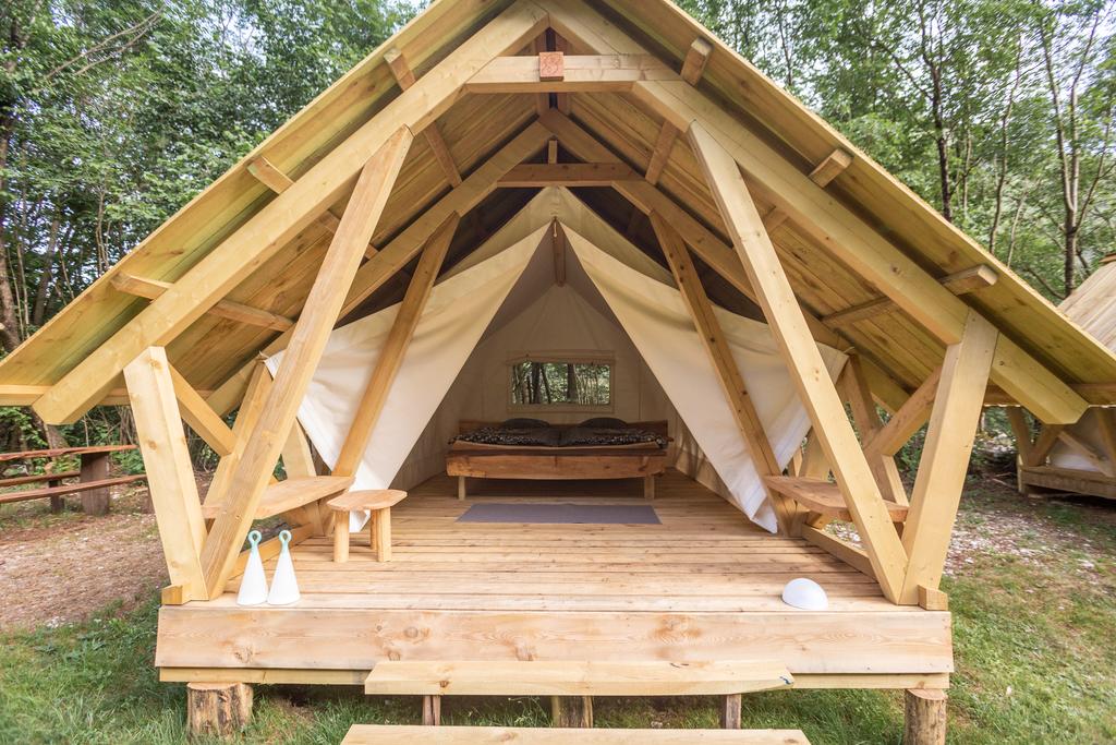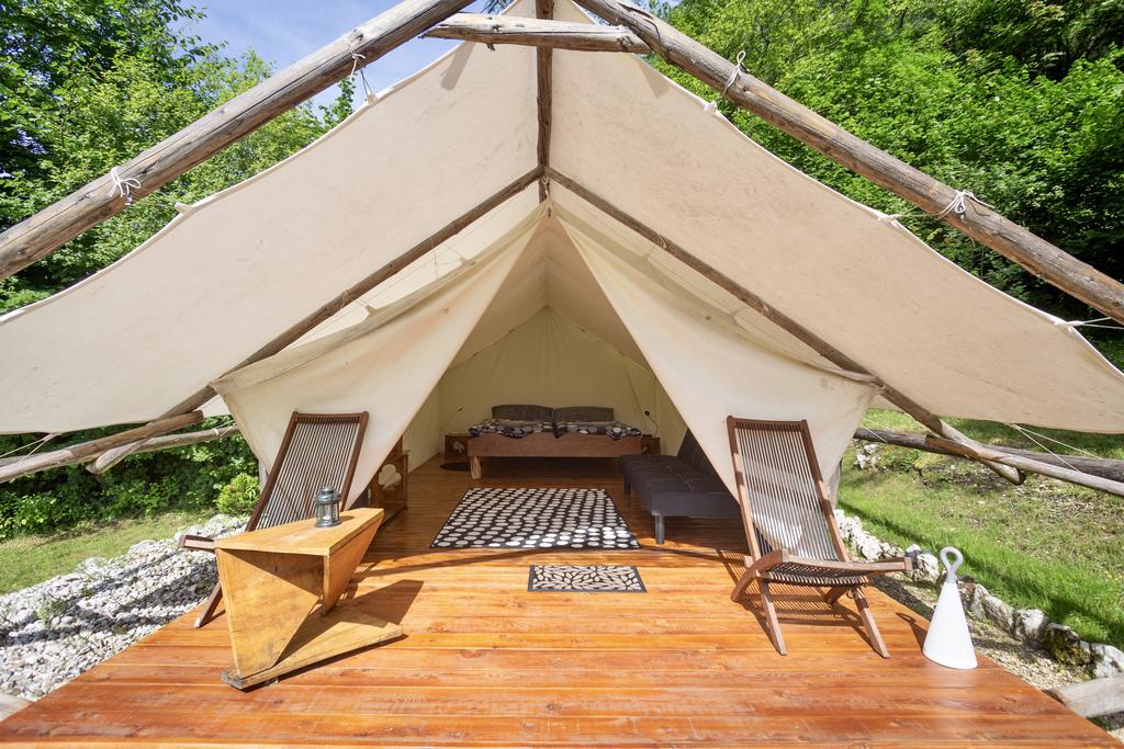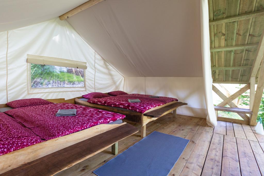 Det finns mer här Soška postelja oziroma Soška postelja Family. Odlični bombažni šotori imajo vso opremo za spanje (vzmetnice, vzglavniki in topla pokrivala ter potrebna posteljnina), streha nad šotori pa nudi senco v vročih poletnih dneh.