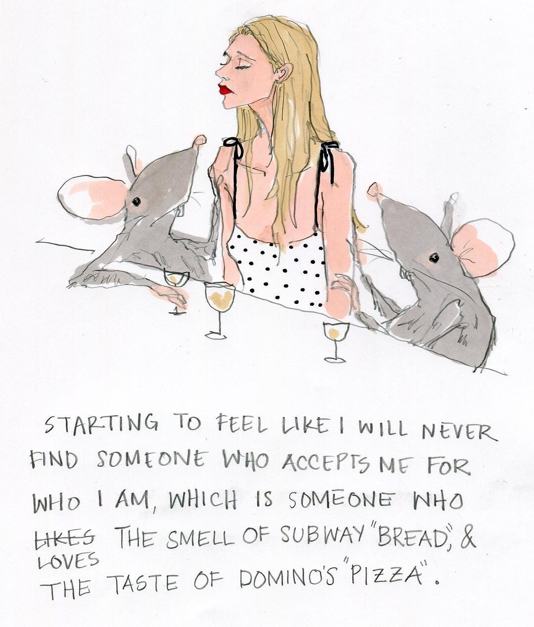 I en nyligen intervju för Vogue Julie sa att hennes illustrationer är inspirerade av människors roliga natur. Hon tycker själv och skämtar ofta om att vi i princip alla är idioter och att det är svårt för henne att komma nära någon som inte är redo att erkänna detta om sig själv. Det är en mycket hård kritik av människor, och hon är ännu hårdare mot sig själv. Och med detta motiverar han också sin sarkastiska natur.