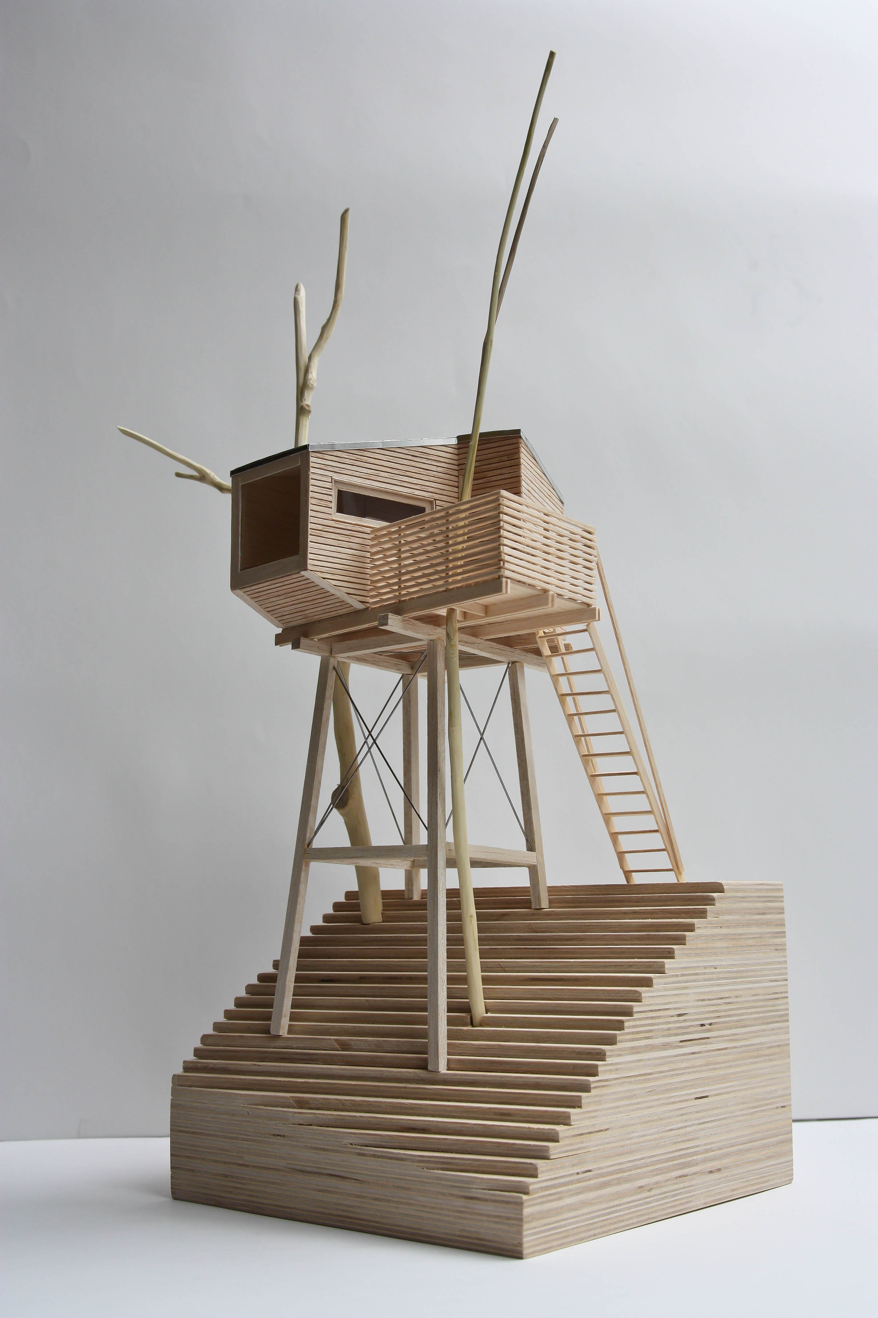 Oblika hiške je prilagojena tako, da je prostor v njej kar najbolje izkoriščen, okna pa so razporejena tako, da omogočajo pogled na vse strani. Površina hiške je šest kvadratnih metrov, razdeljena pa je na dva dela: ob zadnji stranici hiške je velika delovna miza, nad katero je strešno okno, drug del pa je namenjen sedenju oziroma spanju. Pod klopjo je tudi prostor za shranjevanje. Dostop do hiške je po stopnicah, ki vodijo na konzolno teraso, ta pa ima na sredini luknjo, skozi katero raste obstoječe drevo. V hiško je napeljana tudi elektricitet.