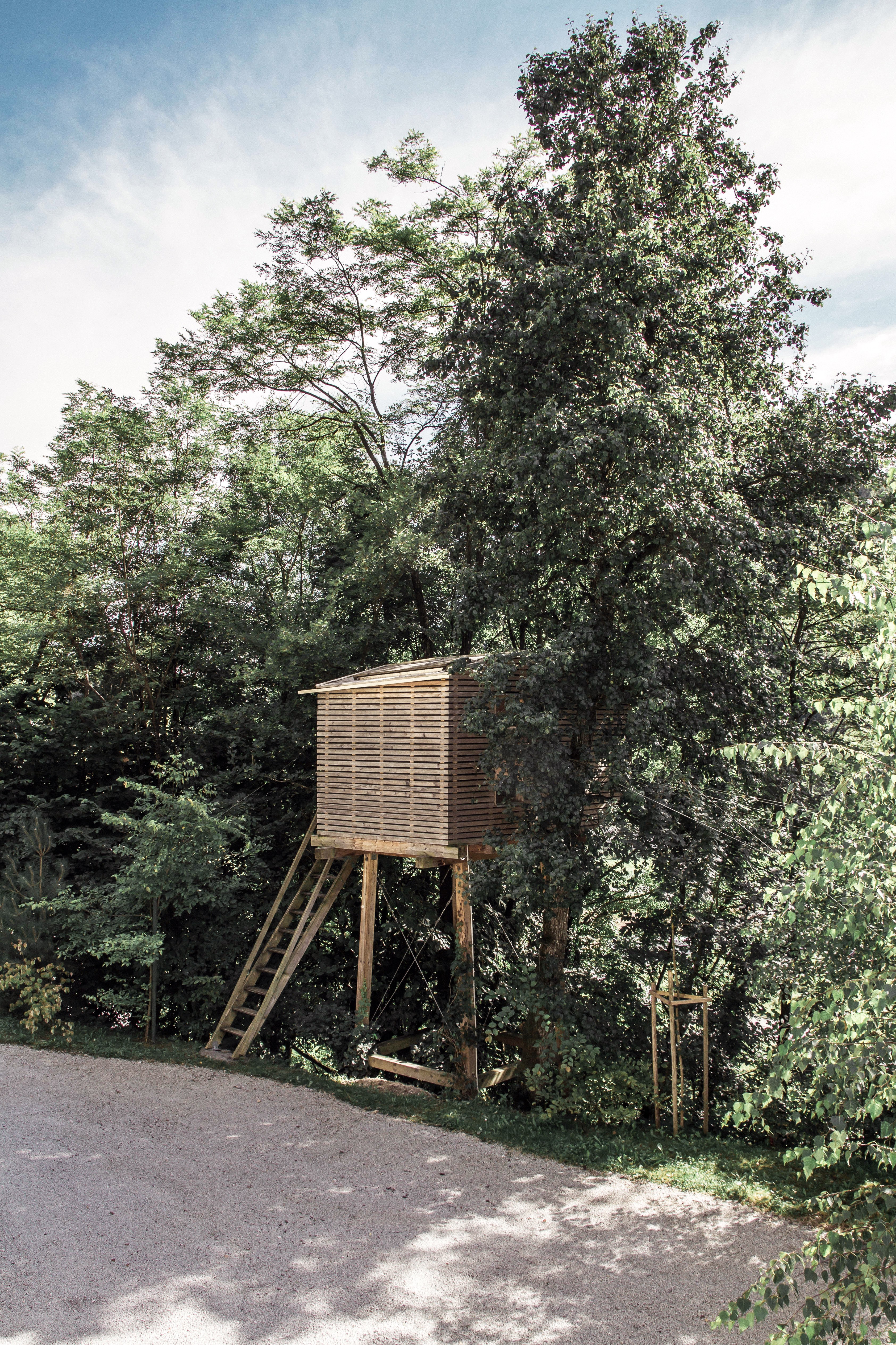 Hiška na drevesu je umeščena na rob podolgovate parcele družinske hiše blizu Lukovice, kjer je strmo zaraščeno pobočje. Ker tam ni bilo dovolj dreves, ki bi dajala dovolj opore za hiško, ta stoji na samostojni konstrukciji in je tako neodvisna od dreves.