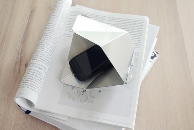 Med sin skalform, Tone betong skruva upp volymen på musiken, som vi spelar på smartphones, och till skillnad från de flesta Bluetooth-ljudförstärkare då tog inte ur telefonens batteri. Vi har precis lagt telefonen i skalet från 3 mm aluminiumkompositpaneler, fodrad inuti med polypropen termoplast, och härifrån är det ren fysik. Förstärkare monteras med två drag, och den är lämplig för alla typer av mobiltelefoner.