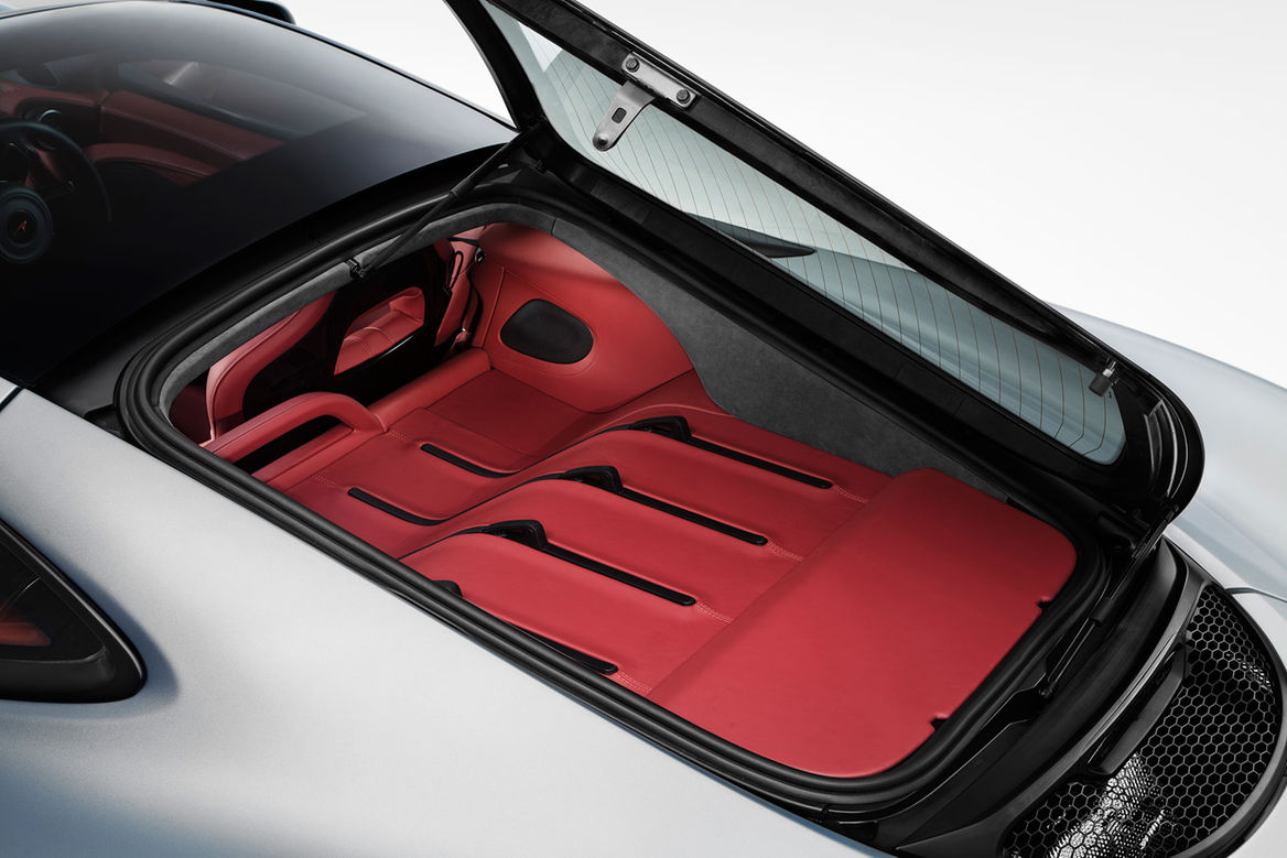 McLaren 570GT är en superatlet som överraskar med komfort och rymlighet. En positiv överraskning väntar oss där bak, där vi hittar ganska mycket bagageutrymme. Den har en mittmonterad motor och vill ha Porsche 911 att ta titeln som den mest bekväma och mångsidiga idrottaren. Det är därför inte konstigt att de har avsatt en ansenlig mängd lagringsutrymme för det och har mätt trunk, som vanligtvis bara finns i mindre stadsbilar (220 liter). Bålen i nosen tillför ytterligare 150 liter. Ändå är 570GT fortfarande en kapabel maskin.