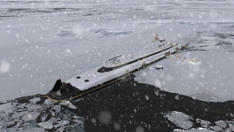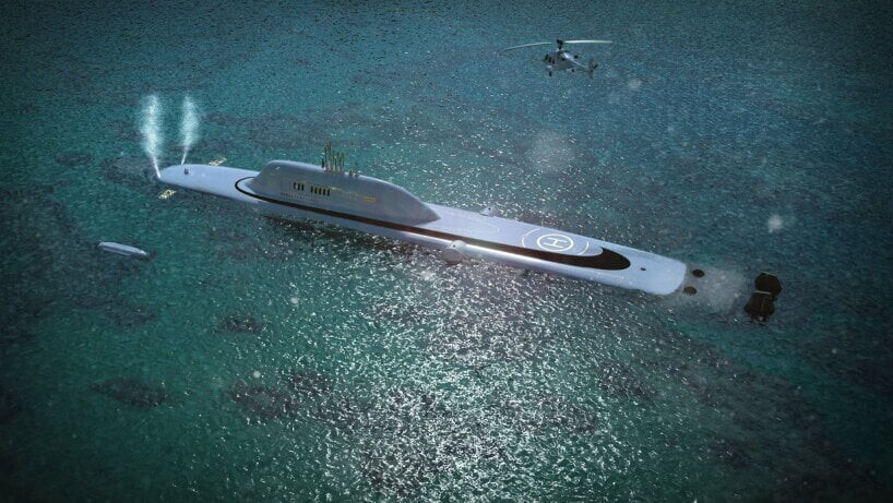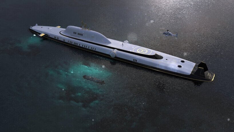 Denna undervattens superyacht har också all nödvändig nödutrustning både över och under vattnet. Ytterligare lyx tillhandahålls av helikopterplattan och helikopterhangaren som finns i ett av tryckskroven. Luft- och landfordon som drönare, luftballonger, stadsjeepar, lastbilar och andra fordon är också välkomna ombord.