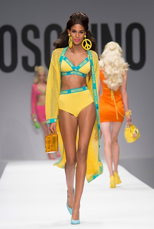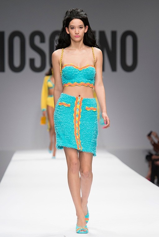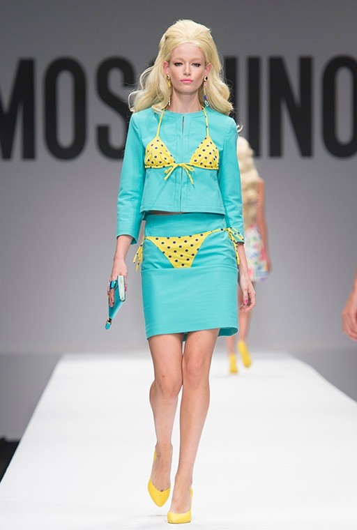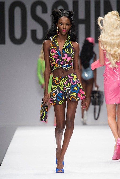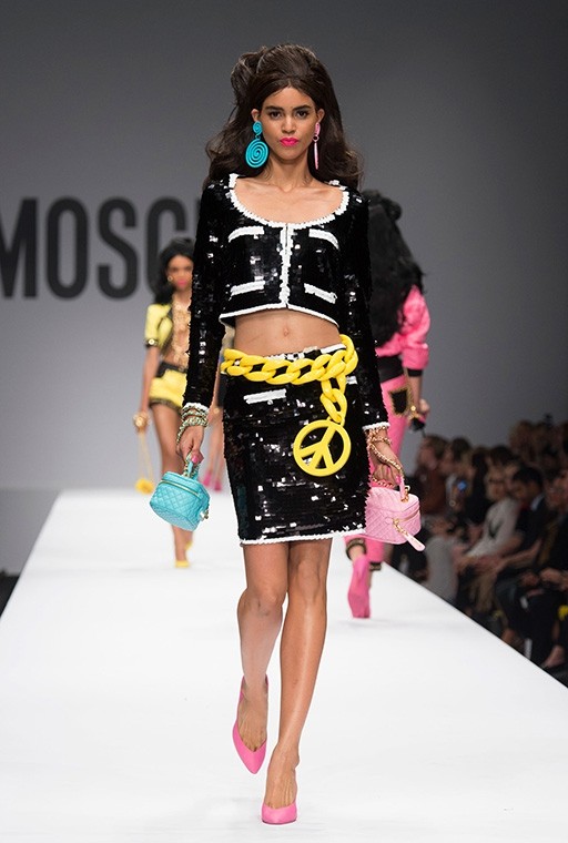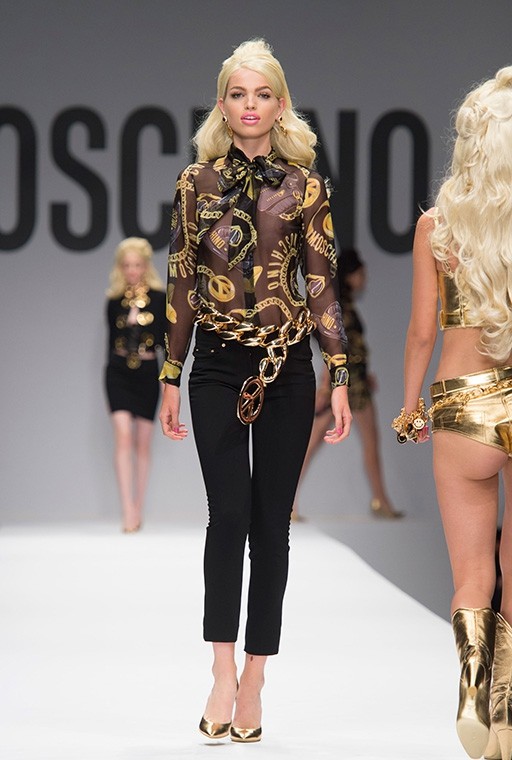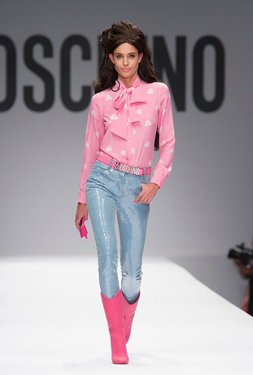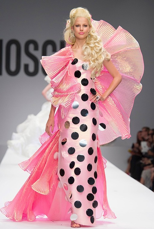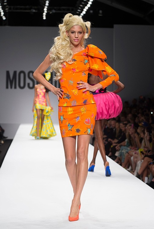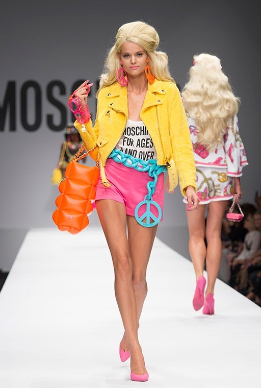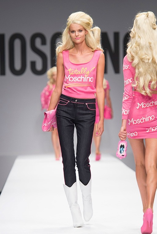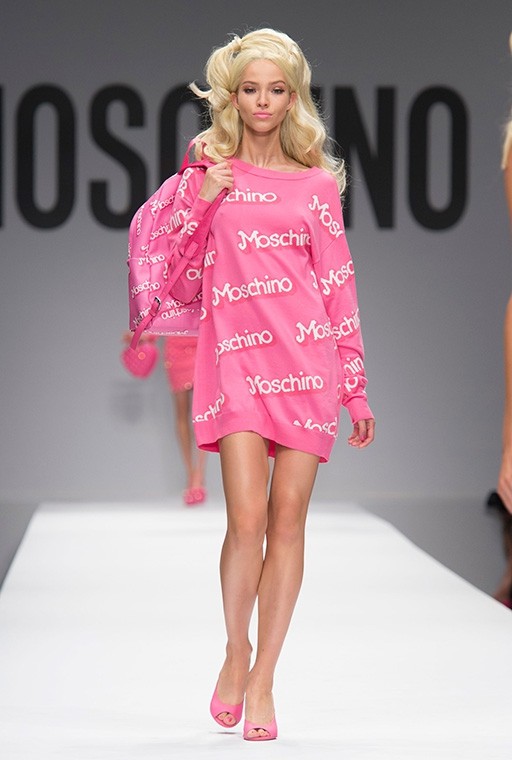 På Milanos modevecka är på Moschinos Flickor gick på catwalken på en modevisning Barbie i mänsklig storlek. Modellerna, som bar övervägande rosa modekreationer, överraskade med stark makeup, platinafärgade lockar och en autentisk presentation i klassisk Barbie-stil. En av dem gick ut på catwalken iklädd rullskridskor, medan den andra hade med sig en rosa plastväska.