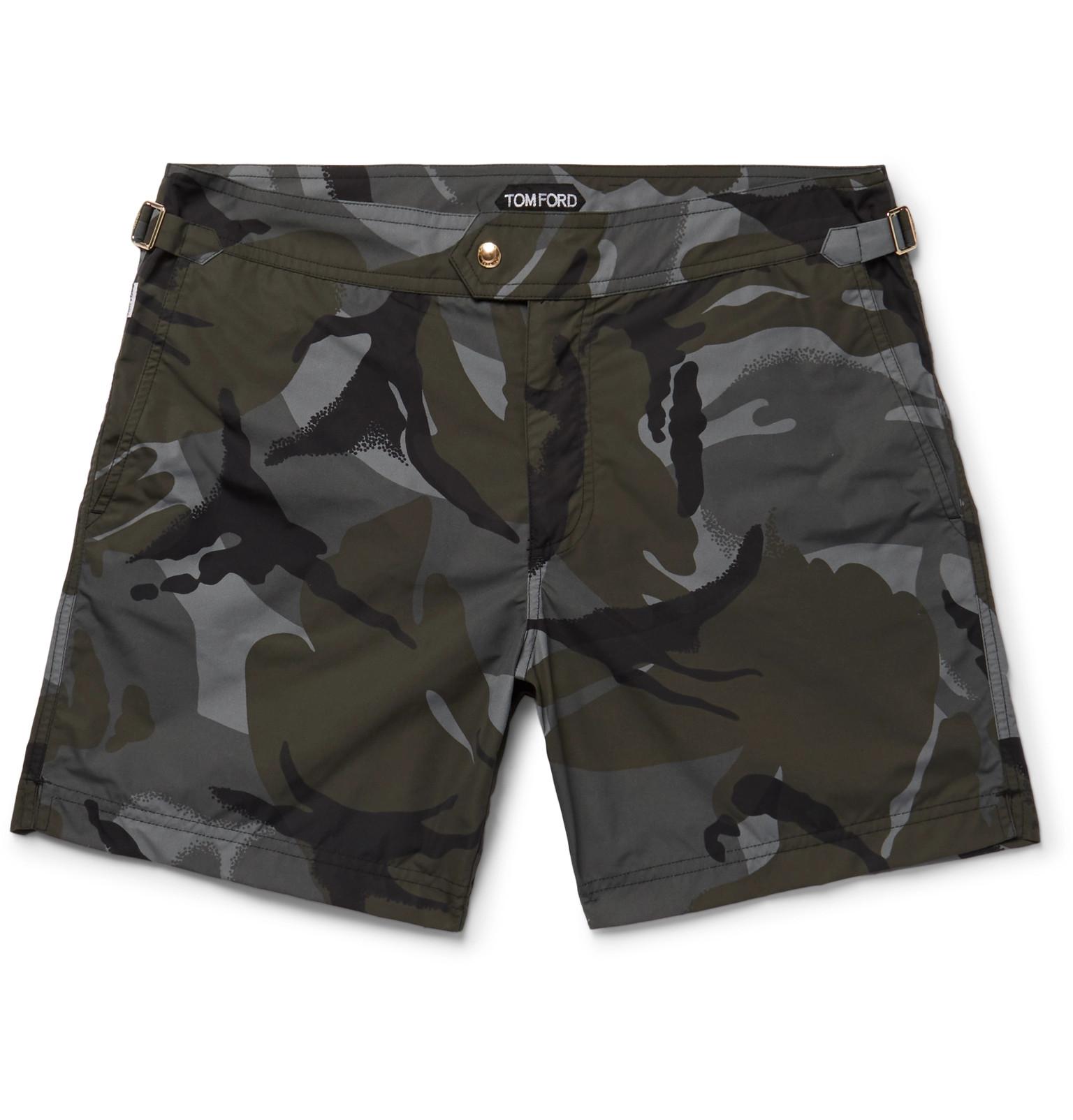 Moški s kopalkami z vojaškim vzorcem izražajo svojo moč. Če vam bo do poletja uspelo utrditi mišice na nogah, vam priporočamo, da izberete nekoliko bolj oprijete kopalke srednje dolžine.