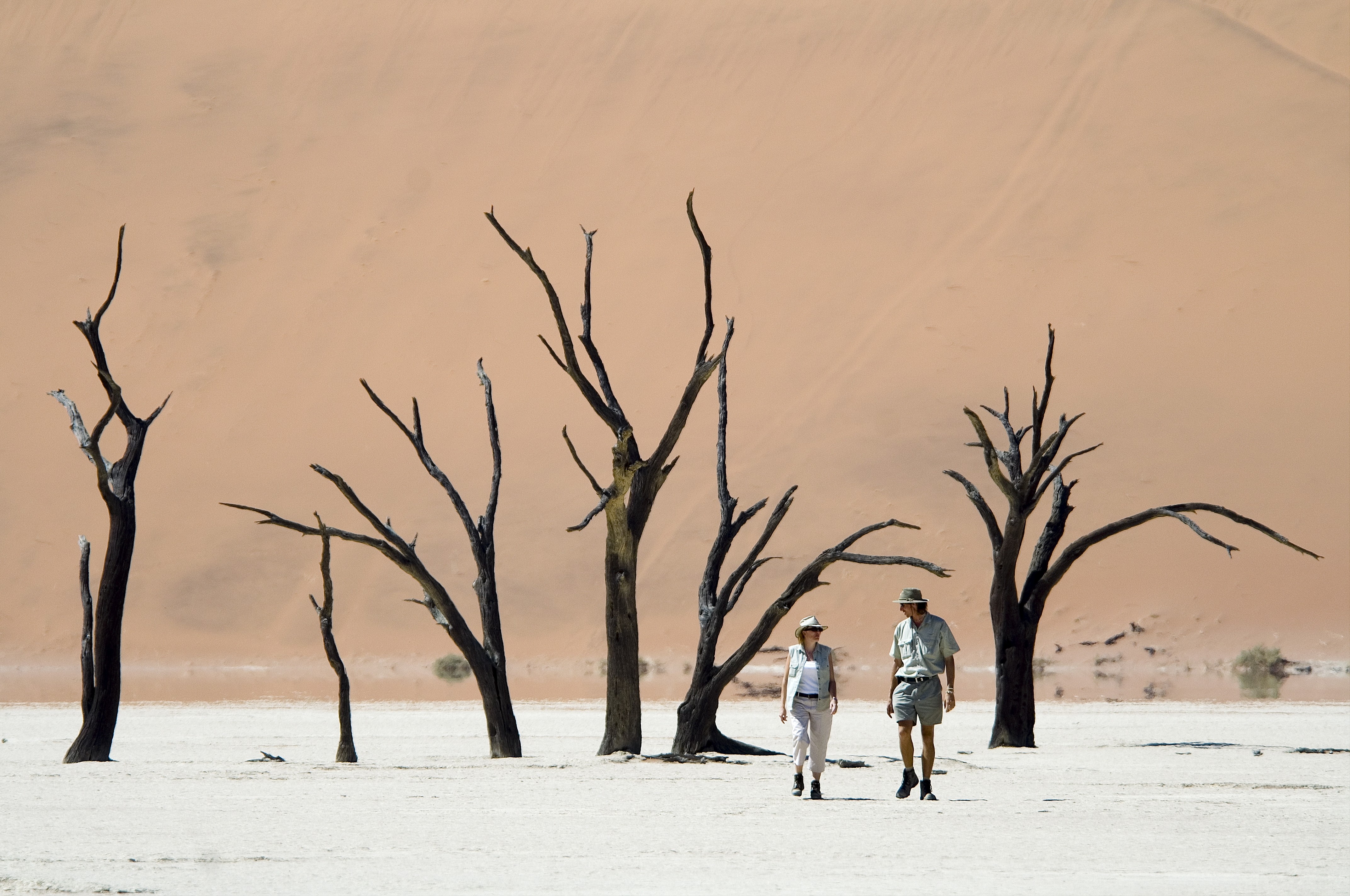 Namib är ett hav av sand och är massiva sanddyner som sträcker sig längs hela Atlantkusten. De är de största i världen och ett av Namibias mest igenkännliga kännetecken. Bland dem är de mest tillgängliga Sossusvlei-sanddynerna, som sägs vara som mest magiska när de fångas vid precis rätt tidpunkt tidigt på morgonen. Medan Namibia är omgivet på ena sidan av Namib, är å andra sidan Kalahari, en halvtorr öken i södra Afrika, som sträcker sig över Botswana, Namibia och Sydafrika. Kalahari kännetecknas av rödbrun sand, och de ursprungliga invånarna i Kalaharidalen där är Bushmän, som fortfarande lever i större familjesamhällen och försörjer sig på jakt och samlande.
