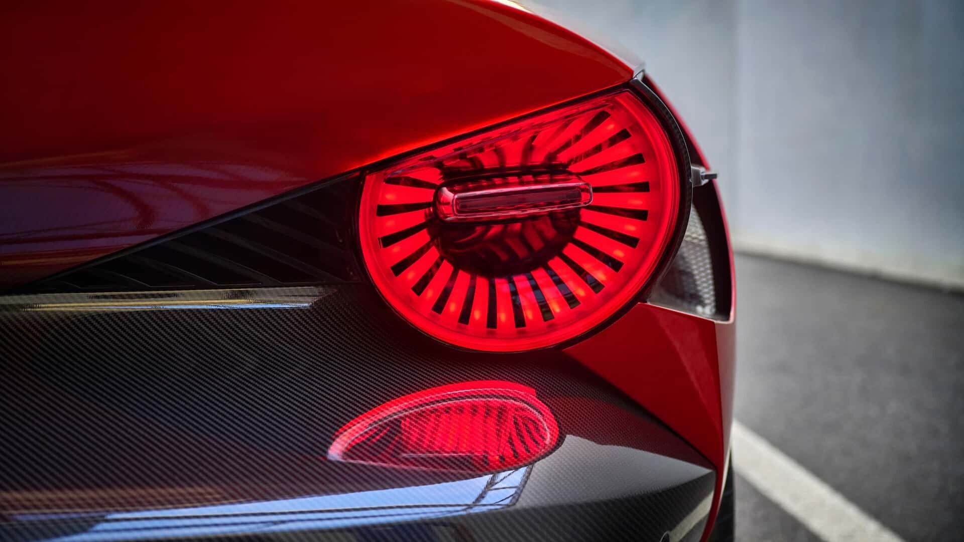 Inredningen i bilen är en sann symfoni av material: läder, kolfiber, aluminium och Alcantara. De två versionerna, Tributo och Alfa Corse, erbjuder föraren en upplevelse som är antingen klassiskt elegant eller modernt sportig.