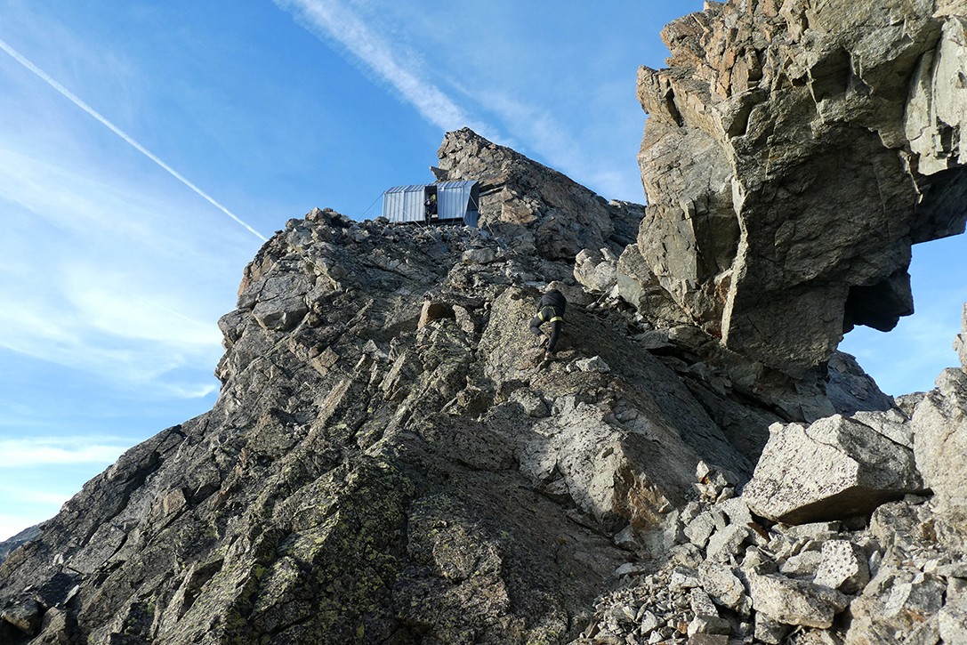Zatočišče, ki je izdelano iz lesa, jekla in aluminija, je bilo zgrajeno predhodno in nato s helikopterjem prepeljano na končno lokacijo. Najdemo ga na več kot 3000 metrih nadmorske višine.