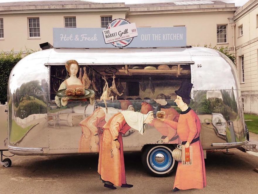 Vi har sett sammansmältningen av traditionellt och modernt förut, men dessa fotomontage, som kombinerar människor från klassiska konstmålningar och moderna utrymmen, kommer att få dig att le, eftersom de är som gjutna.