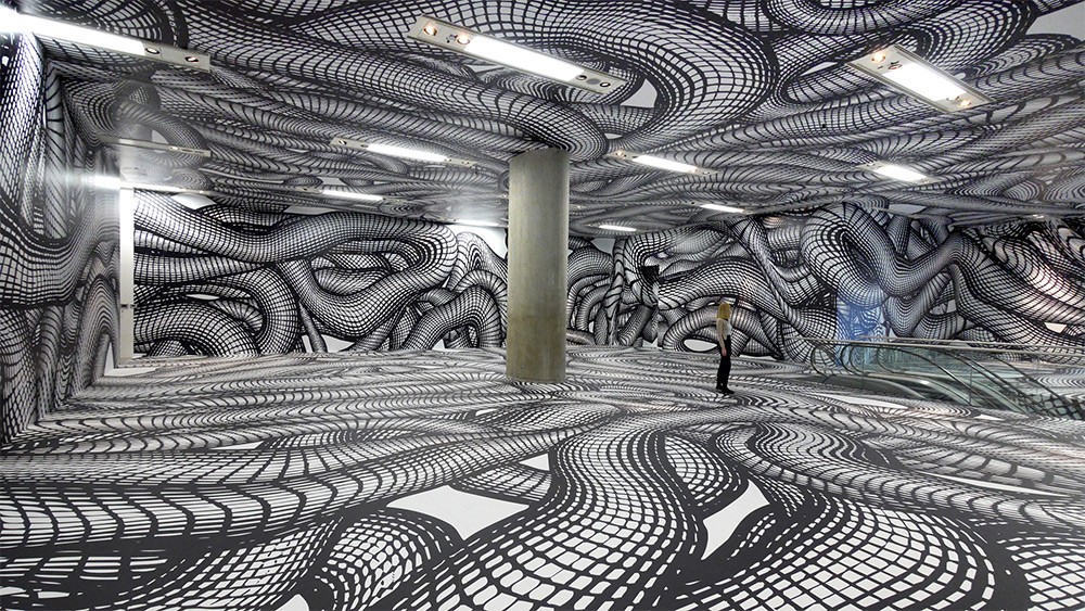 Precis som Museum of Illusions i Ljubljana leker lokalerna för Bryssels konstgalleri ING Art Centre och ERES-Stiftung i München ärligt med mänsklig perception. Detta gjordes av Peter Kogler, en världskänd österrikisk konstnär som fick dig att ifrågasätta dina sinnen med sin monokromatiska grafik.