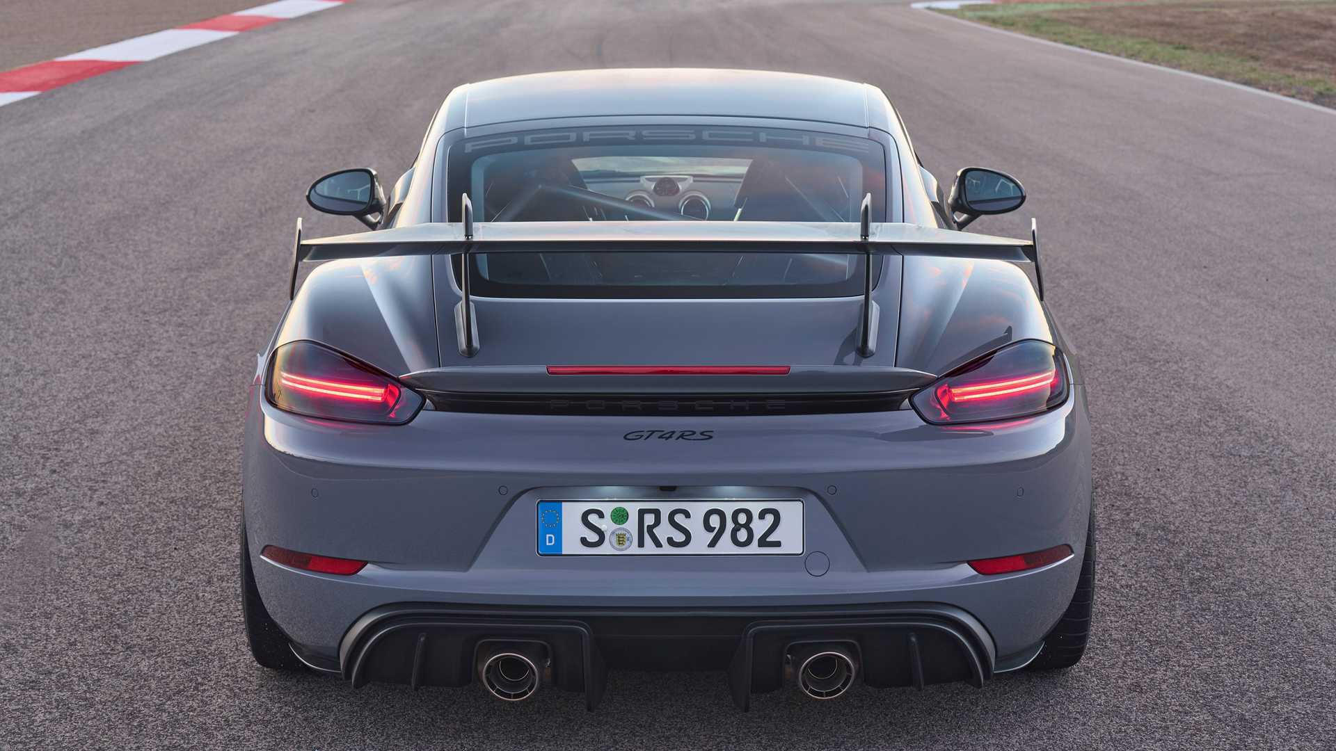 Ytterligare aerodynamik tillhandahålls av den skrymmande bakre luftdeflektorn, vilket också är en uppenbar designskillnad med Cayman GT4-modellen. Förutom bakspoilern är bilen full av andra aerodynamiska tillbehör som sörjer för 25% större kraft (återigen Cayman GT4 för jämförelse) drar bilen till marken. För köpare av den giftiga Porsche Cayman GT4 RS är de på Porsche design producerade till och med armbandsur inspirerade av dem form och kapacitet den snabbaste bland Caymans.