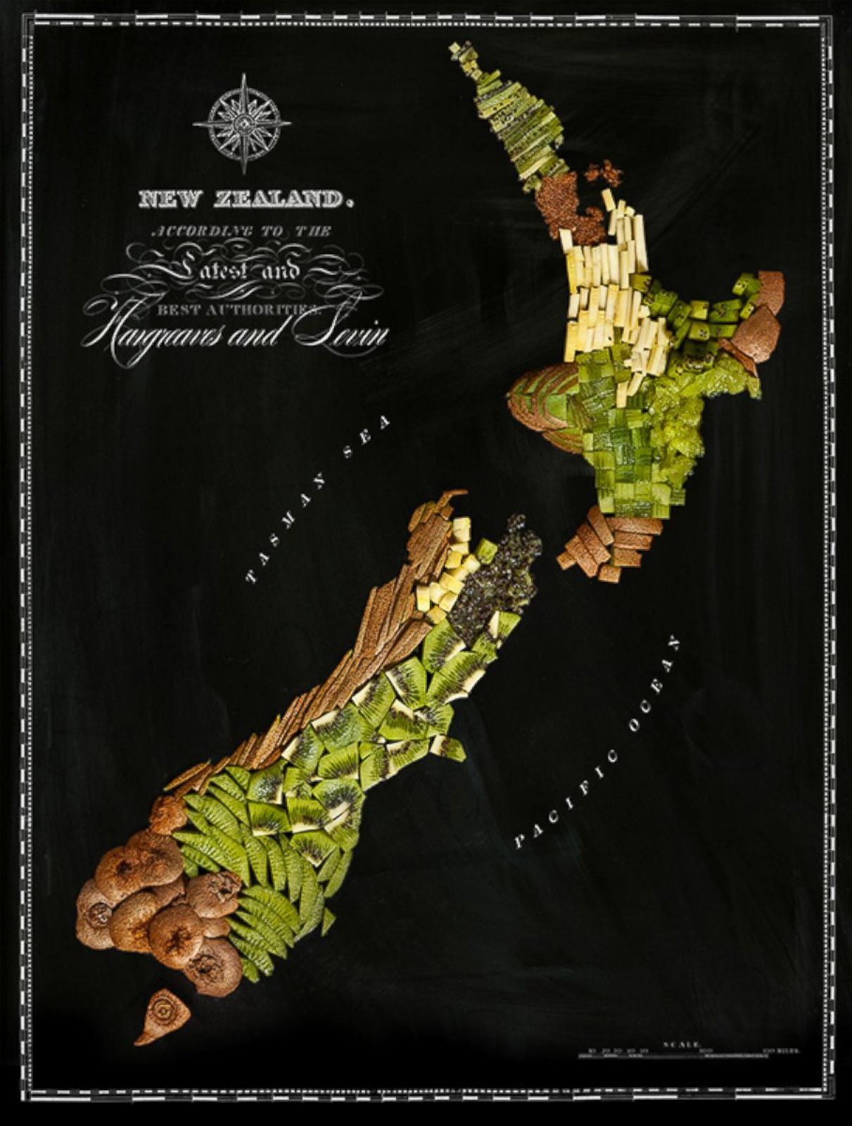 Nya Zeeland konstnär Henry Hargreaves, stylist Caitlin Levin och designer Sarit Melmed de kombinerade idéer och uppfann roliga "kulinariska kartor" länder. Dom gjorde karta över länder gjorda av grönsaker och frukter, olika kryddor och andra ingredienser. Kina består alltså av nudlar, Italien av tomater och Amerika av majs. Roliga kulinariska landskartor de visar oss hur mat omger världen, förändras och blir en del av den kulturella identiteter ett visst utrymme. Om vi vet det tomater kommer från Anderna, det är Italien tomatdrottningen. Projektet handlar om universalitet och kopplingen mellan olika nationer och kulturer med hjälp av kulinariska upplevelser. Mat för oss samman, gör nya bekantskaper och framför allt öppnar vi upp oss gränser för olika kulturer.