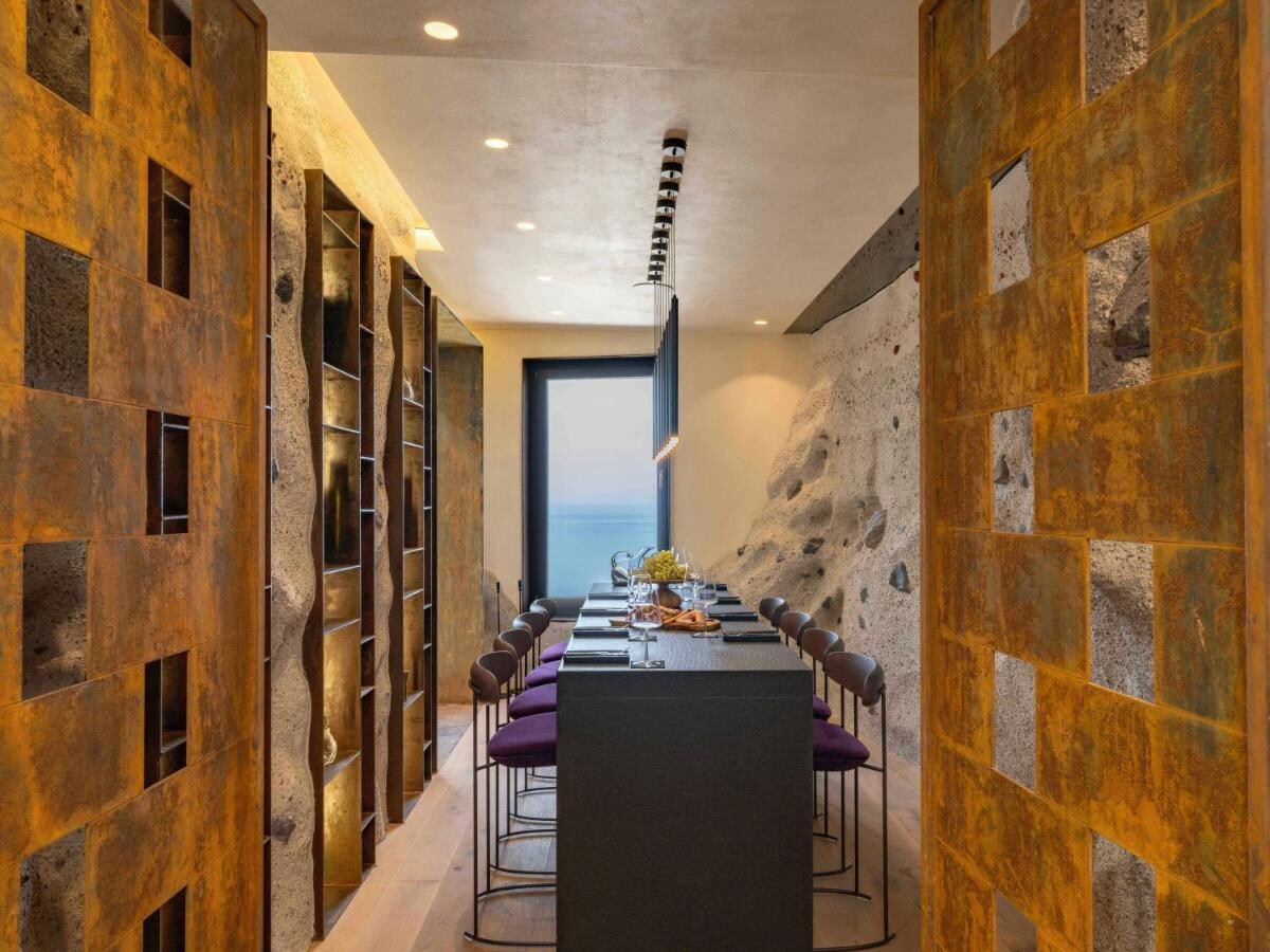 Hotellets interiör har en minimalistisk design som kombinerar traditionell kykladisk arkitektur och delar av Santorinis gruvtradition. Hotellets interiör är täckt av natursten och material som trä, keramik och smide. Med sin lugnande färgpalett skapar den en rogivande plats att ta en paus från vardagens liv och rörelse.