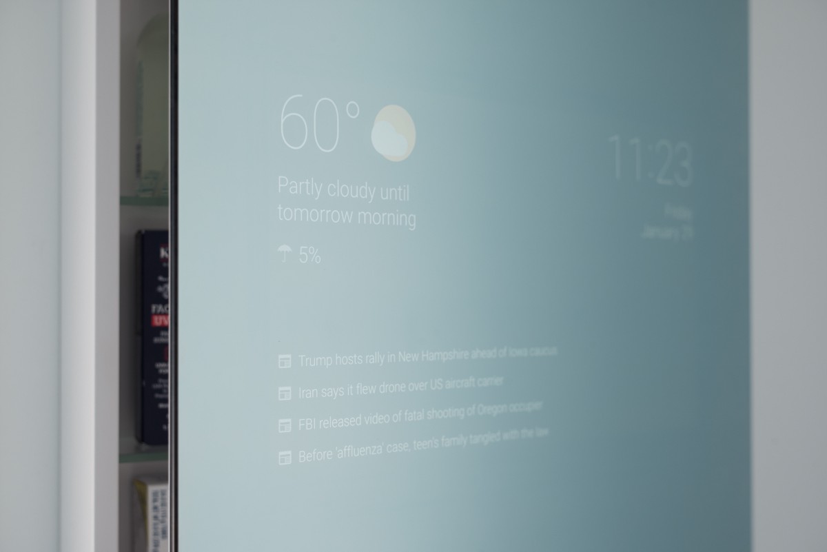 Smart spegel det är smart spegel, utvecklad av en Google-ingenjör Max Braun. För att göra det använde han en halvgenomskinlig spegel (sådan de har i förhörsrummen, ja, det är i alla fall så i amerikanska filmer), som förutom spegelbilden är på bekostnad av en tunn skärm mellan speglarna och teknologier som mjukvara Android, kunna visa tid, datum, väder och nyhetsrubriker. Allt detta medan du borstar tänderna, rakar dig eller gör håret.