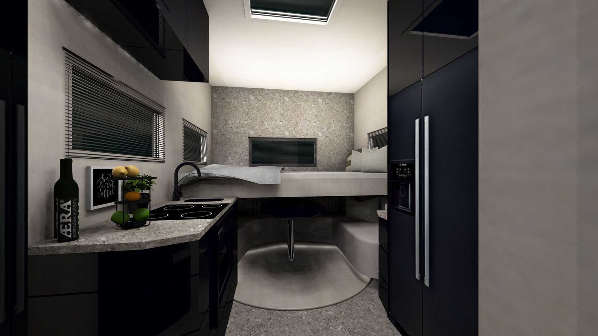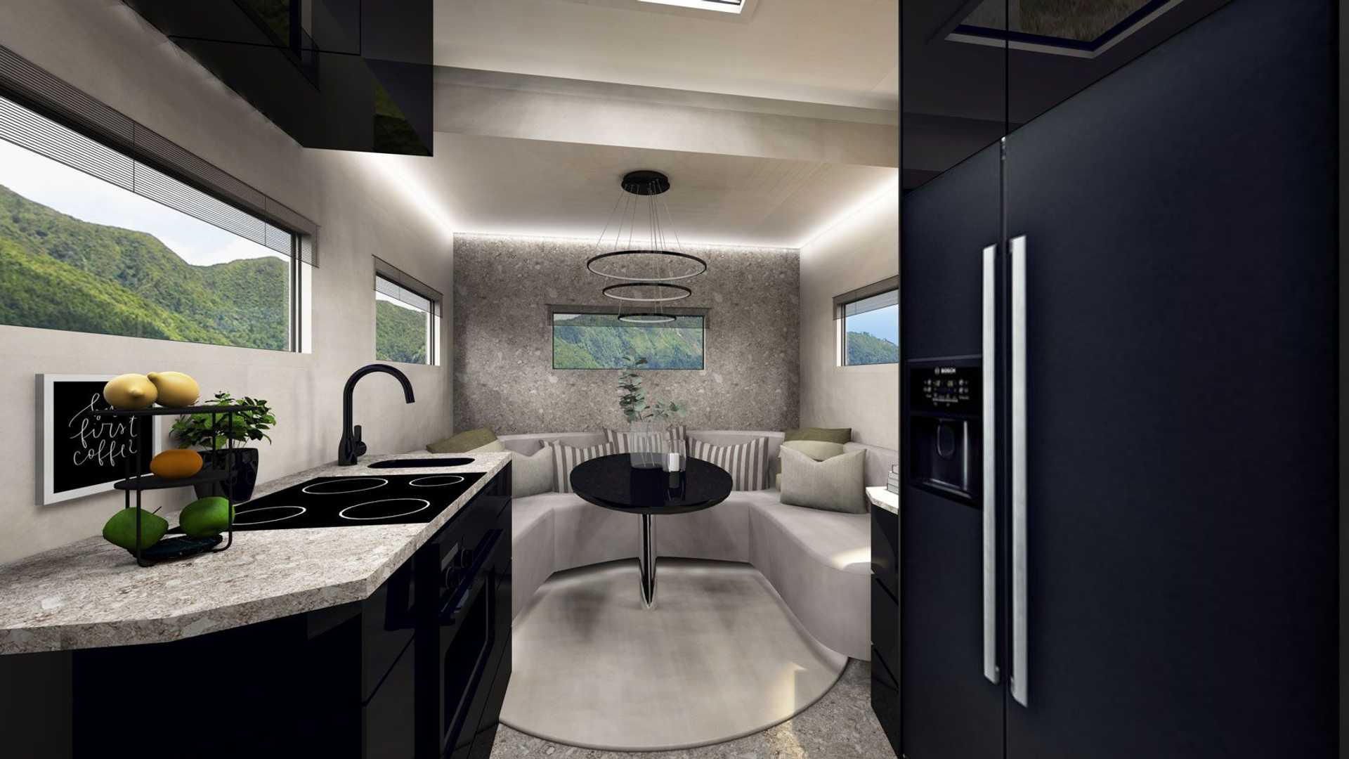 Kombinationen av vitt, svart och grått ger oss intrycket av att jag står i något modern lägenhet. Användarna har till sitt förfogande en större soffa, ett litet soffbord bredvid och till och med en takkrona ovanför båda. Det fullt utrustade köket har en induktionshäll med fyra ʺeldstäderʺ, en ugn och ett handfat i marmorimitation. Den här gången är kylen inte liten, utan snarare en helt fristående enhet med frys. Badrummet är precis lika prestigefyllt som resten av husbilen. Ögat dras omedelbart till den ovanligt designade toaletten. Bredvid badrummet finns det huvudsakliga ʺsovrummetʺ.