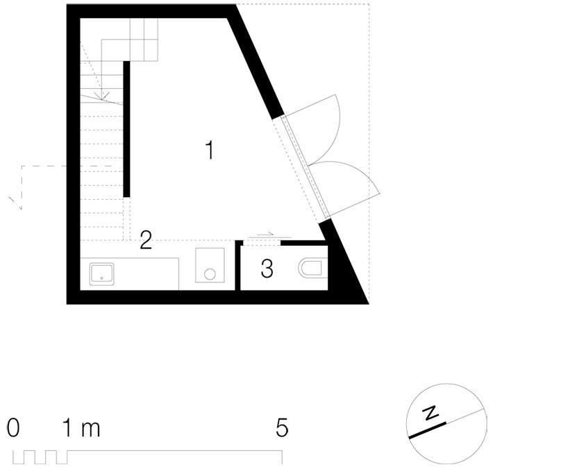 Ovanför entrédörren, som ligger bredvid triangulärt fönster den enda "öppningen" finns triangulär fasett, som fungerar som en baldakin. På bottenvåningen erbjuder Tower Studio tillfälliga gäster litet kök och toalett, första våningen fungerar som ateljéoch den tredje som balkong. Och om de fortfarande leder till första våningen trappa, det är nödvändigt att nå toppen med hjälp av en stege.