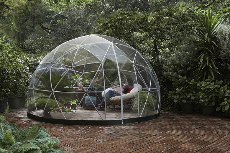 Trädgårdsigloo 360 den är multifunktionell geodesisk kupol för trädgården och andra utomhusområden som kan fungera som en romantisk vrå för James Bond-värdiga middagar, en barnhörna, ett "hotell" med otaliga stjärnor, en trädgårdsbod, ett tak (om du köper ett beige överdrag)... Trädgårdsigloo är miljövänlig och ett utmärkt alternativ för alla typer av skydd. Dess skelett är tillverkat av PVC-stöttor och höghållfasta nylonfogar, som är täckta med transparent PVC-beläggningGarden Igloo 360 är över 2,2 meter hög, har en diameter på 3,6 meter och kan förlängas per 10 kvadratmeter.