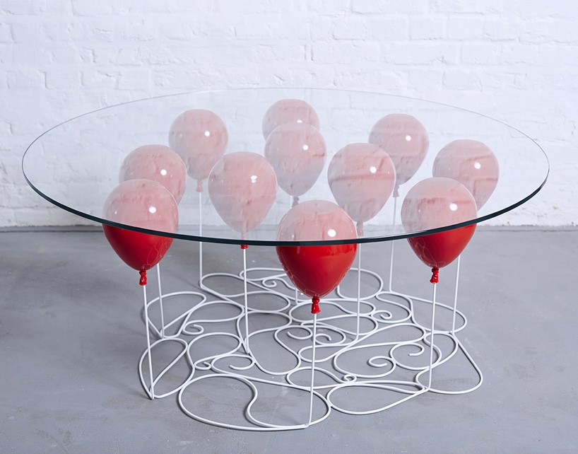 Steklena klubska mizica UP Balloon je klasične noge, kot nosilne elemente, zamenjala za rdeče, zlate in srebrne balone. A brez skrbi, ti kot rečeno niso pravi, tako, da vam doma ne bo treba hraniti še bombe s helijem, pa tudi vrvice so umetne in zvite na tleh predvsem zato, da omogočajo stabilitet in pričakovano lastkapacitet mize.