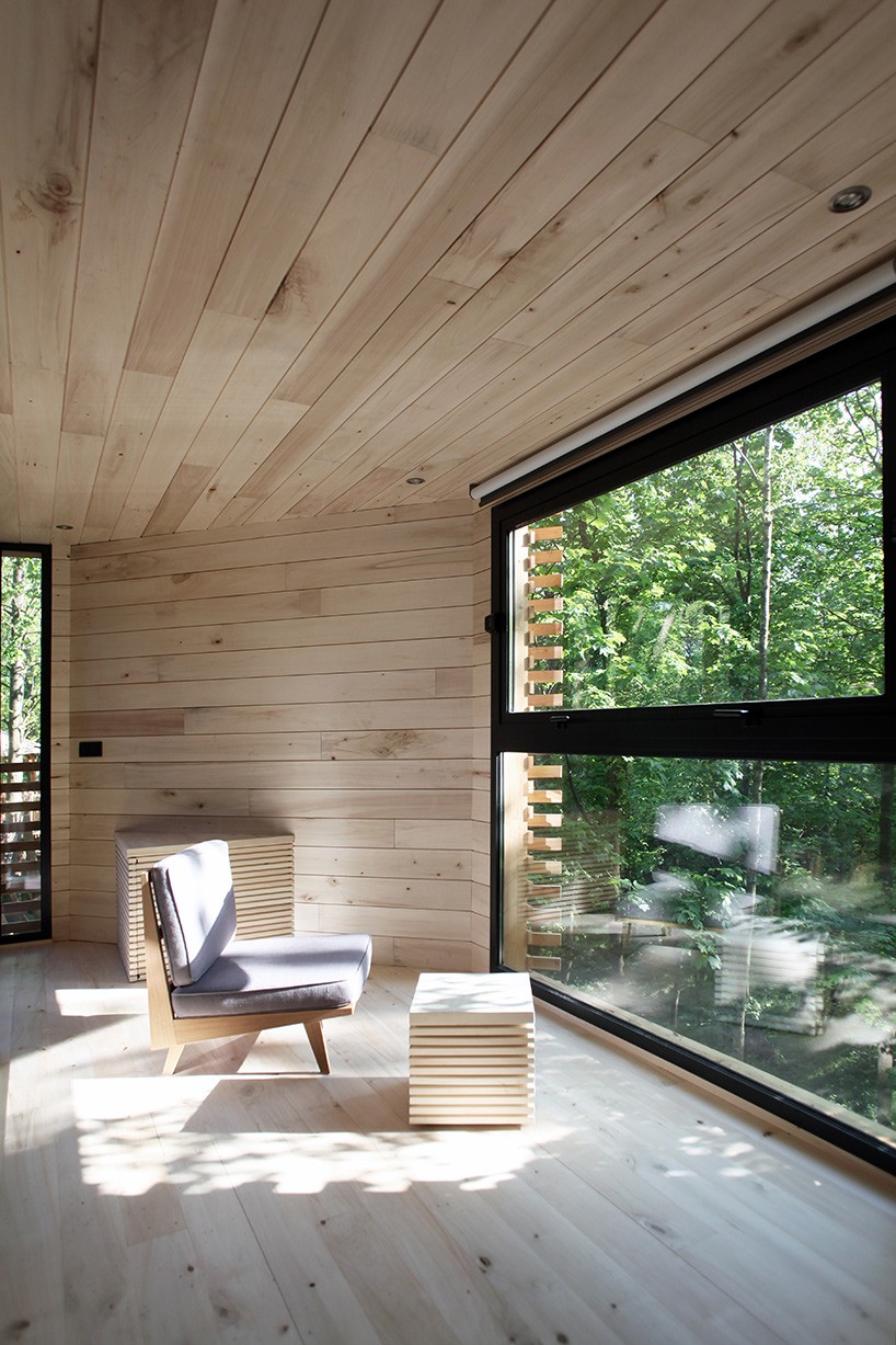 Den leder till huset hängbro, 10 meter över marken. Rummet mäter 23 m², men kan acceptera 2 gäster. Två glasdörrar öppnar sig i de inre utrymmen där de är vardagsrum, sovrum och garderob och badrum. Varje rum är utrustat med ett fönster, så att du kan observera omgivningen hela tiden. De inre utrymmena är också upplysta av naturligt ljus, och de avgränsas av väggar av trä poppel. Det är också på taket av huset terrass.