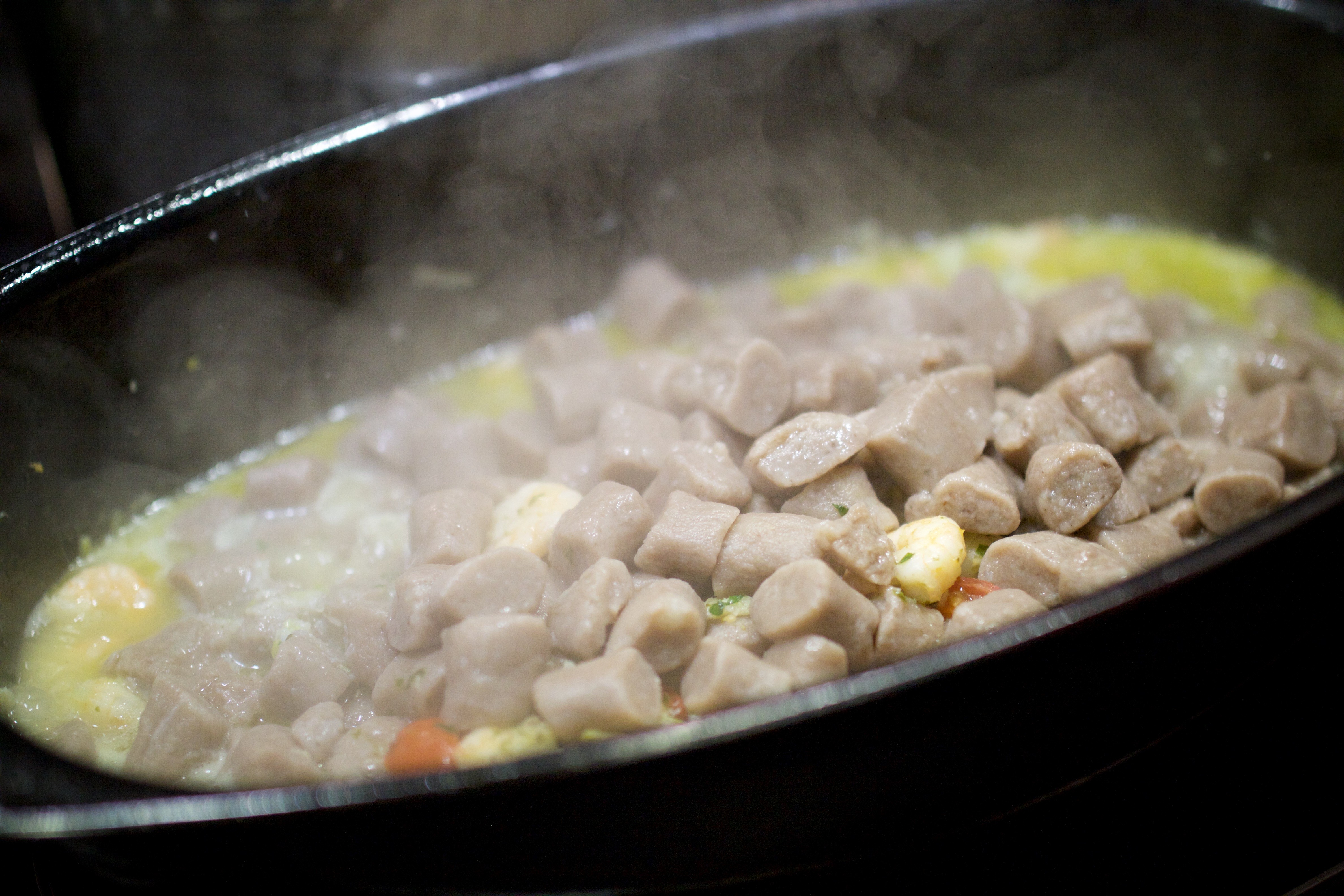 Spretno in z obilico humorja nas je popeljal in angažiral pri pripravi hobotnice v solati, kostanjevih njokov z gamberi in ribo, pečenega krompirja in govejega zrezka ter sladice s kozjim sirom, ki je lepo zaokrožila tri urice druženja ob štedilniku. Ob hrani pa je naše brbončice razvajalo tudi različno vino in uradna voda dogodka Grop.