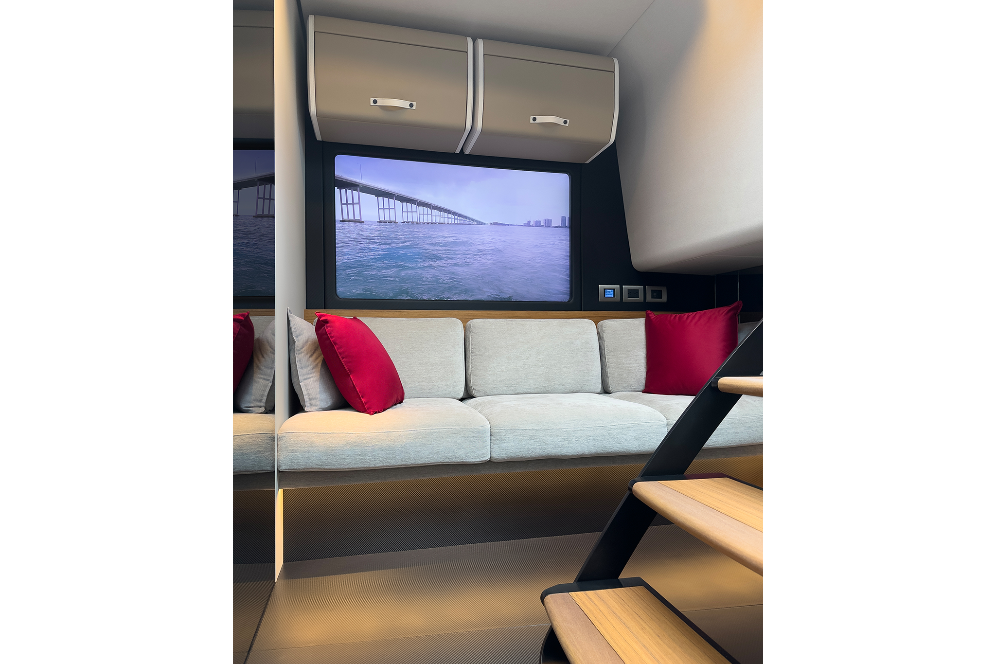 Och så är det interiören. Huvudattraktionen på baksidan är den cirka 7 kvadratmeter stora solsängen med en baldakin sträckt över kolfiberramen. Och om du trodde att det var allt, så har du fel. Interiören erbjuder också två långa soffor, ett badrum till höger och en dusch till vänster. Framåt ligger ett dubbelrum som vetter akterut. Och även om skåpen och garderoberna ser ut som om de är från 1950-talet, står de i skarp kontrast till den ultramoderna atmosfären överallt annars.