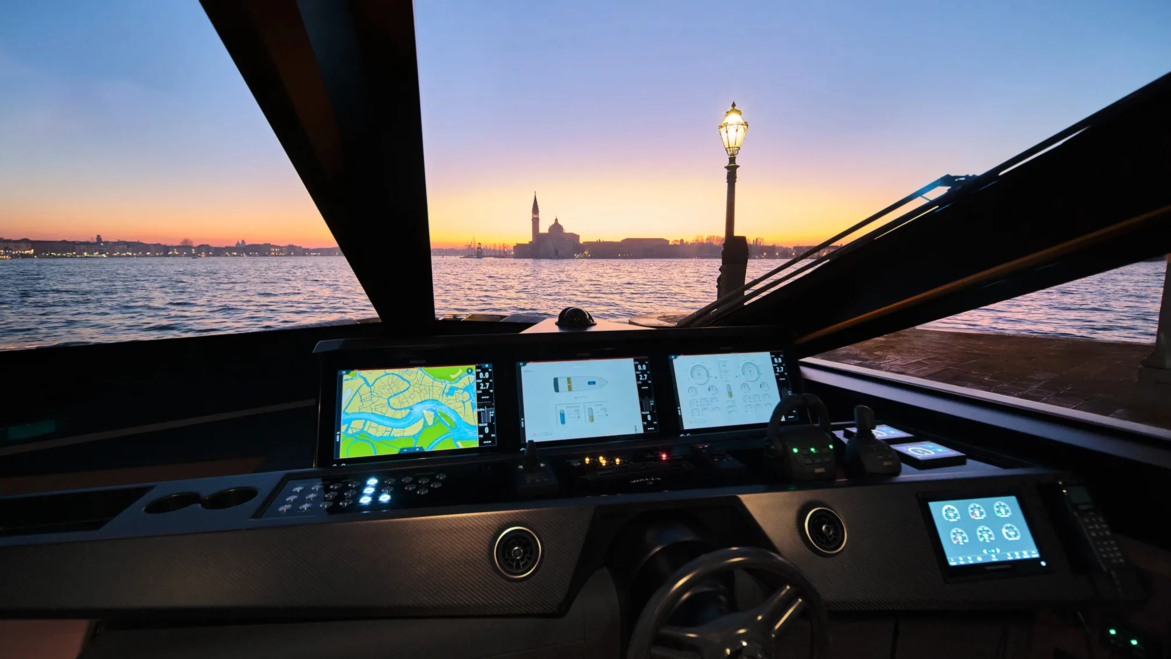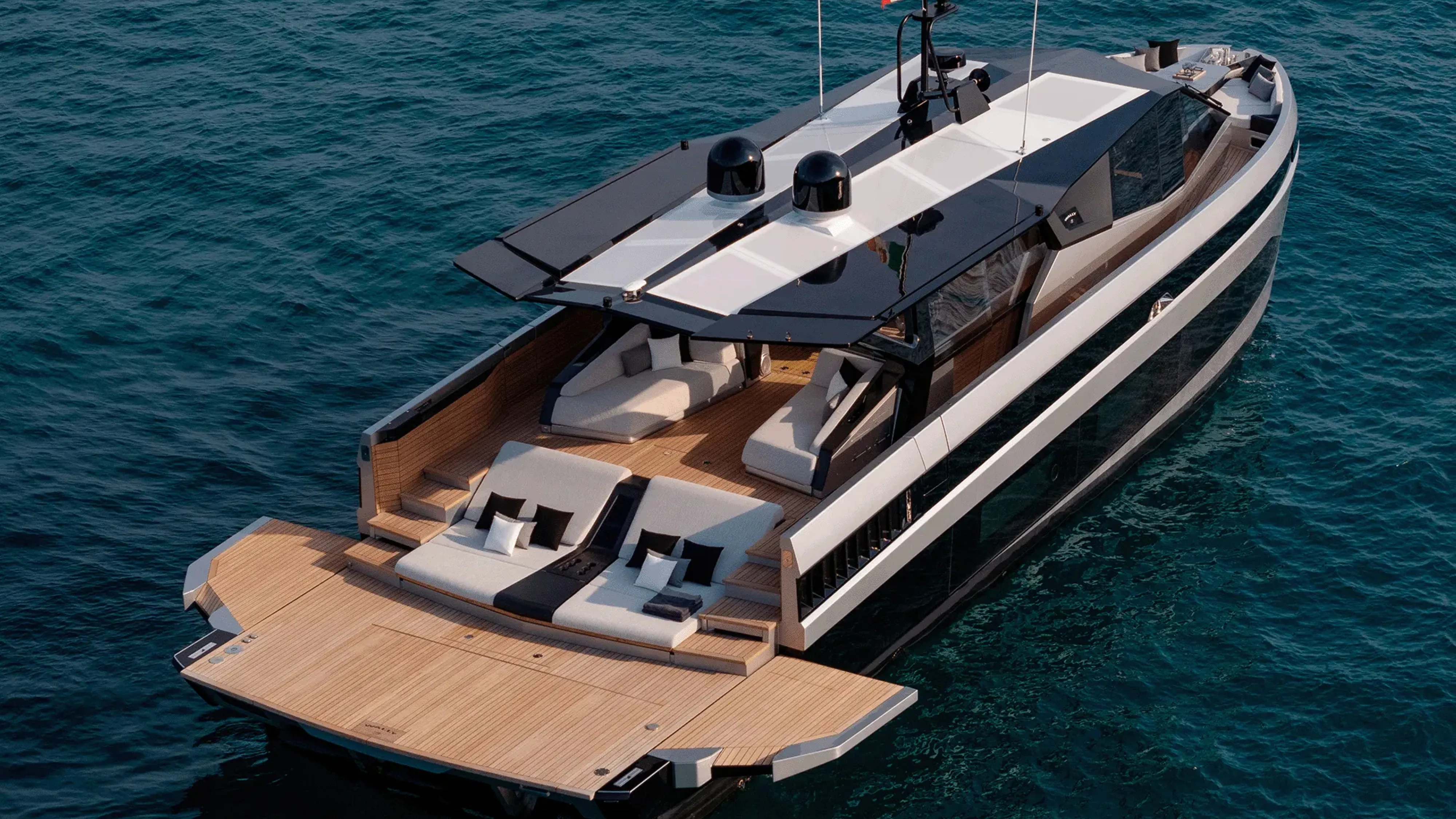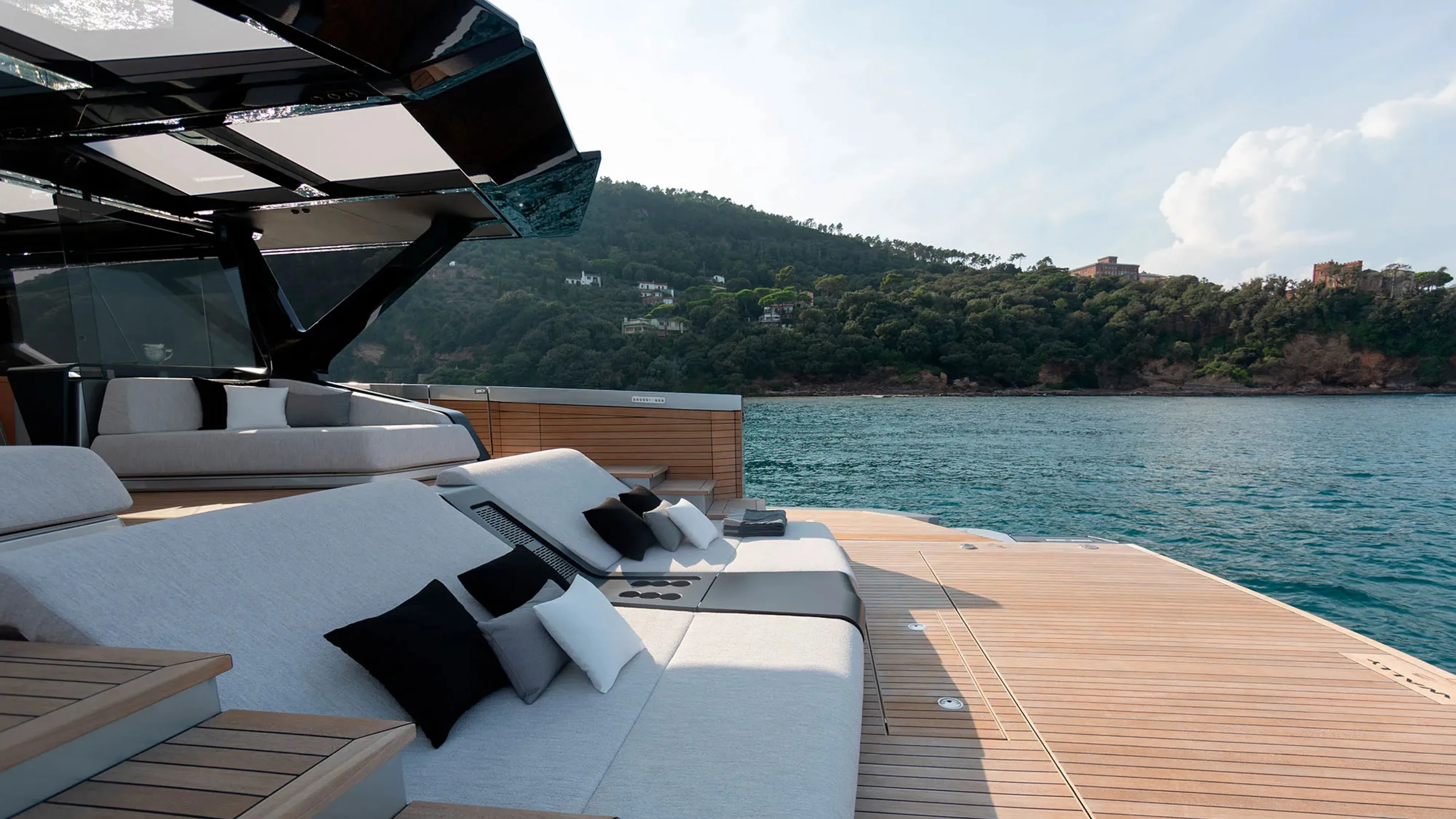 Dess futuristiska siluett och enorma glasytor skapar känslan av att sväva i en filmuppsättning. Inredningssalongen och bron kan stängas av helt med eleganta glasdörrar – eller allt kan öppnas upp för att låta frihetens vind blåsa in i yachten. Uteserveringen med ett elegant runt bord för sex personer är en riktig scen för fester under stjärnorna.