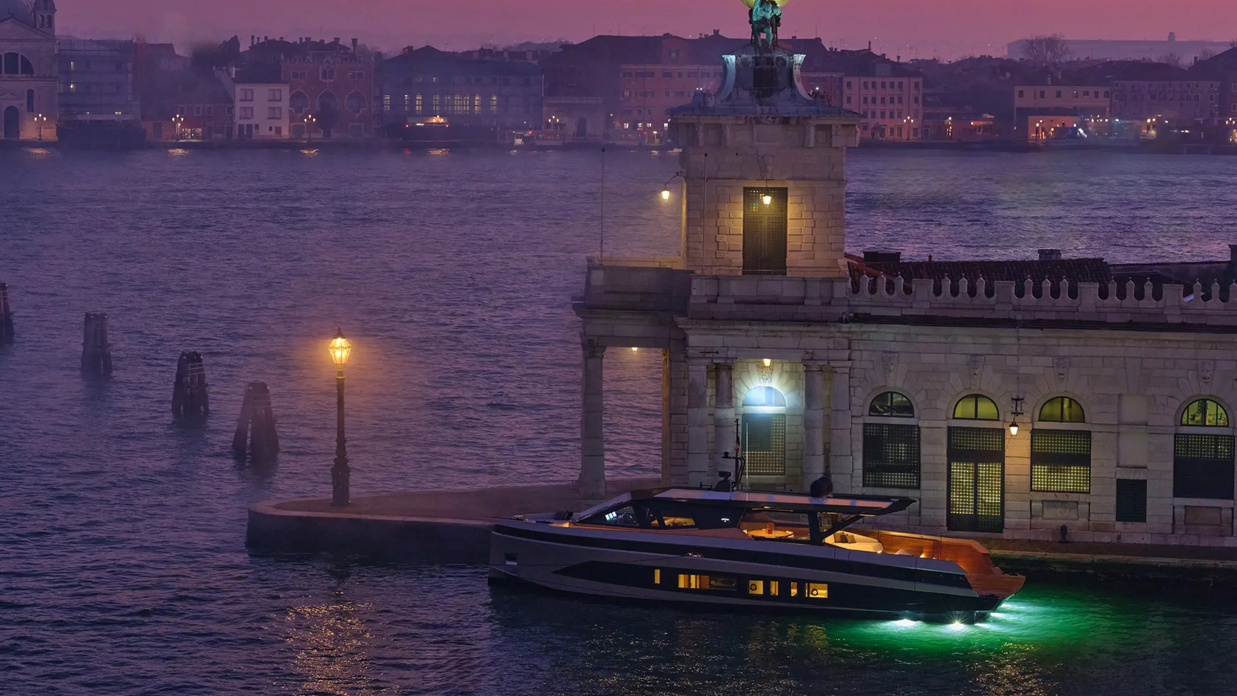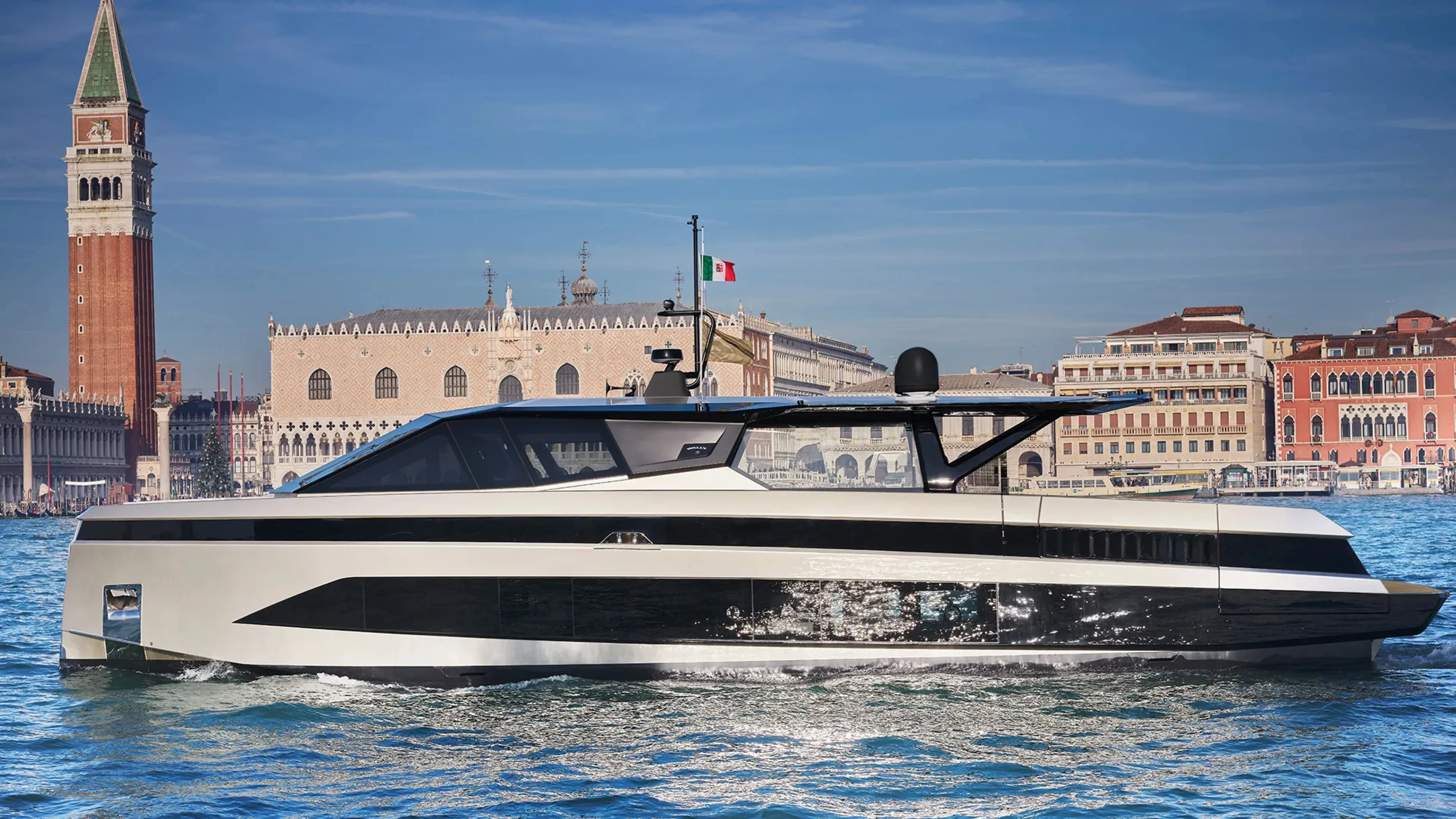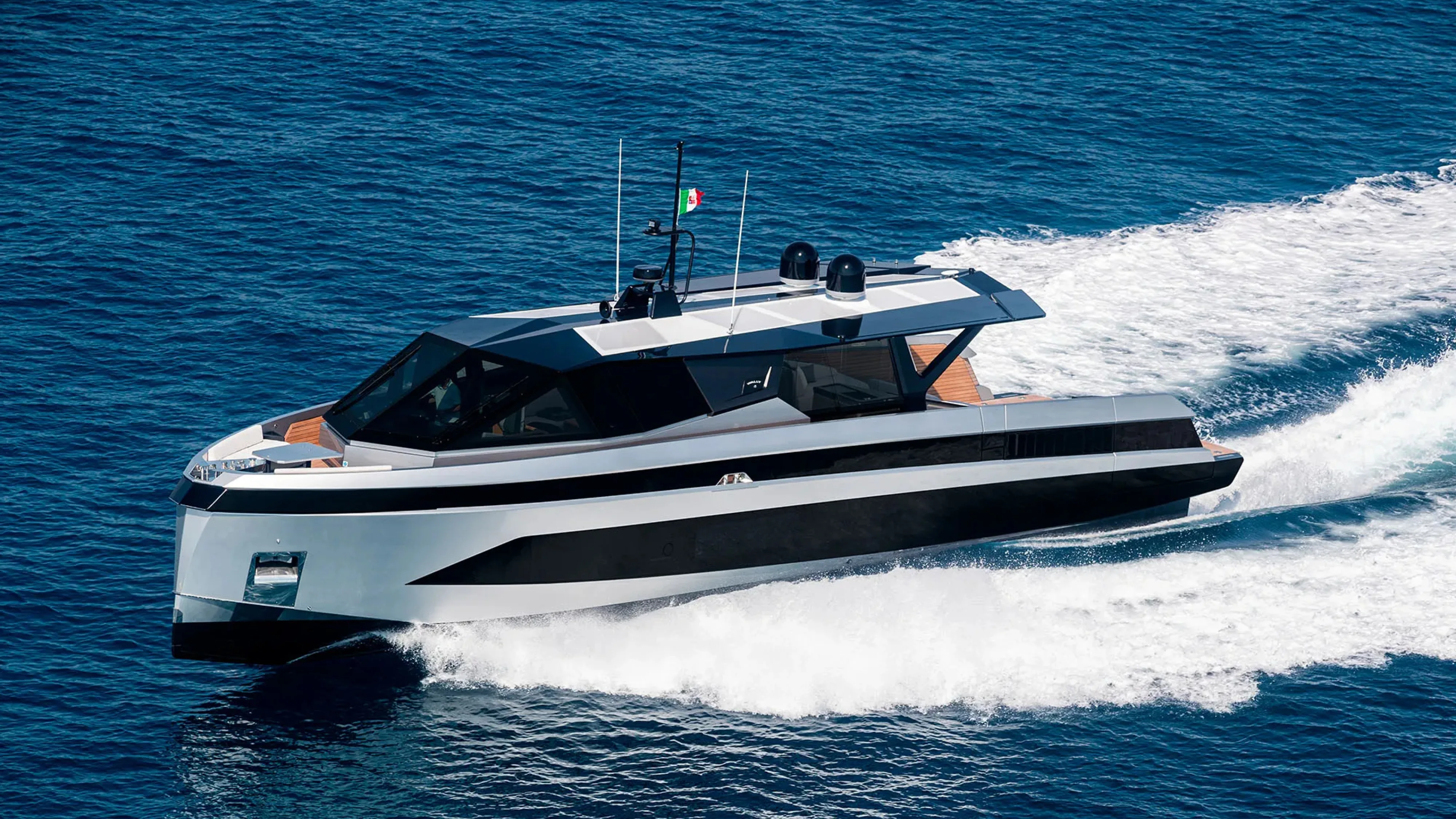 Dess futuristiska siluett och enorma glasytor skapar känslan av att sväva i en filmuppsättning. Inredningssalongen och bron kan stängas av helt med eleganta glasdörrar – eller allt kan öppnas upp för att låta frihetens vind blåsa in i yachten. Uteserveringen med ett elegant runt bord för sex personer är en riktig scen för fester under stjärnorna.