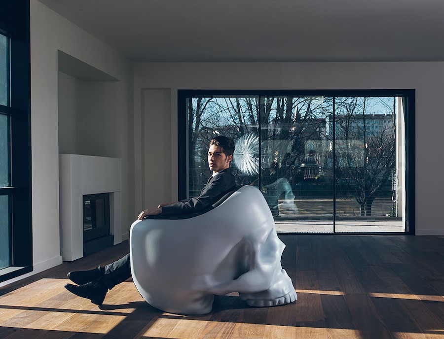 Naslanjač v obliki lobanje är designerns verk Gregoryja Bessona, ki mu nenavadno pohištvo ni tuje. Izdelan je gjorda av glasfibrer, sedalni del pa je odet v kakovostno läder.