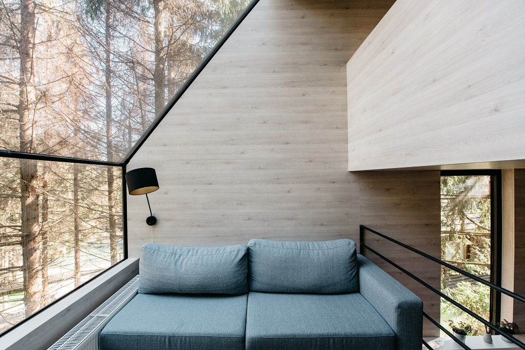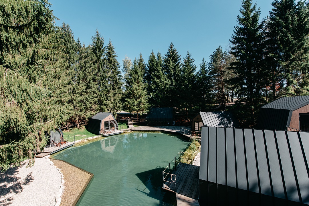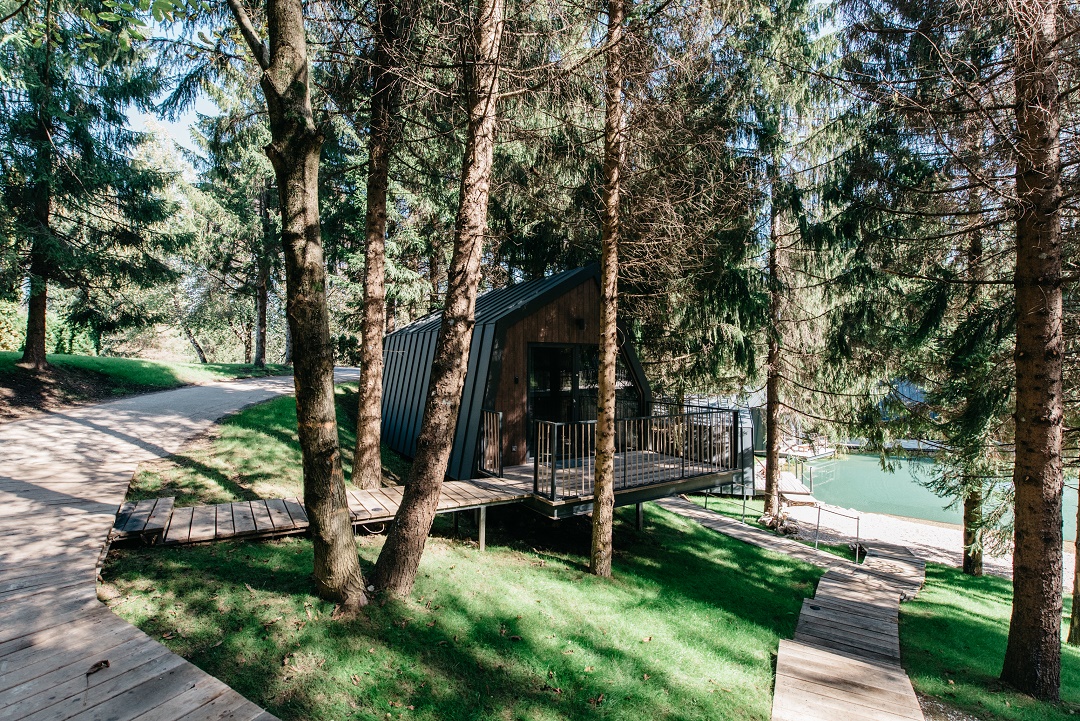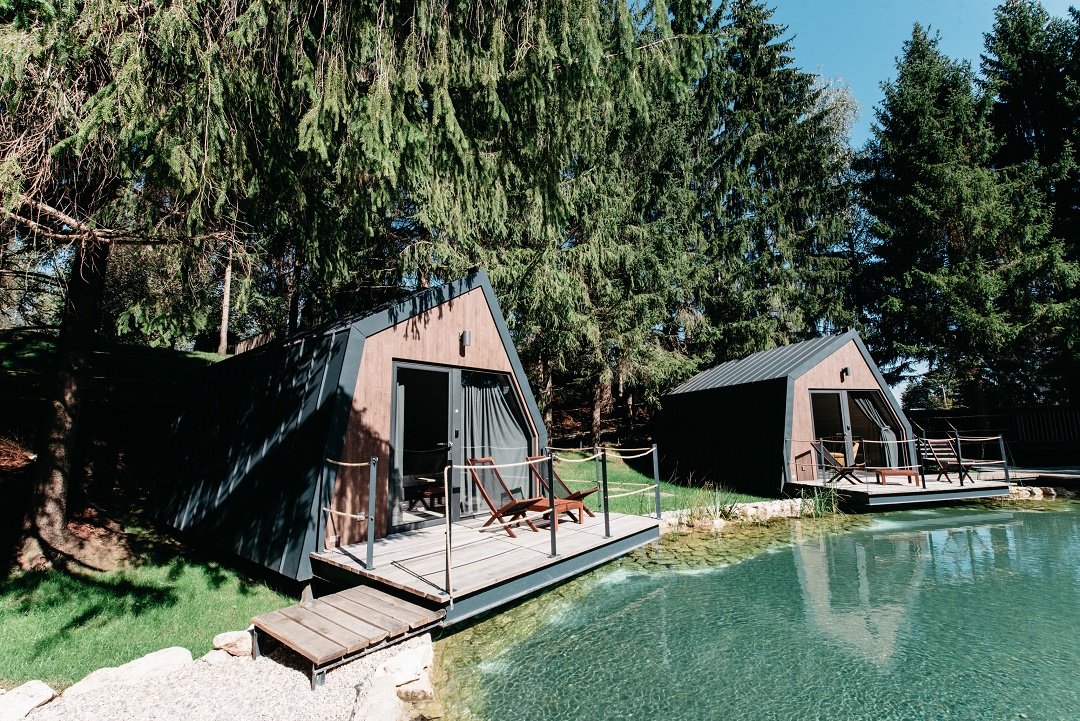 Pet posebej opremljenih lesenih hiš se razteza na treh nivojih, z dvema kopalnicama, dvema spalnicama, dnevno sobo in kuhinjo ter nudi udobno in razkošno nastanitev za štiri osebe. Na samem jezeru pa je devet manjših hiš z zakonskimi posteljami in kopalnico. Zasebnost zagotavljajo okoliška drevesa, ki v vročih dneh ponujajo tudi prijetno senco, vsekakor pa velja omeniti dejstvo, da so zaradi dobre izolacije in centralnega ogrevanja na voljo za najem skozi vse leto.