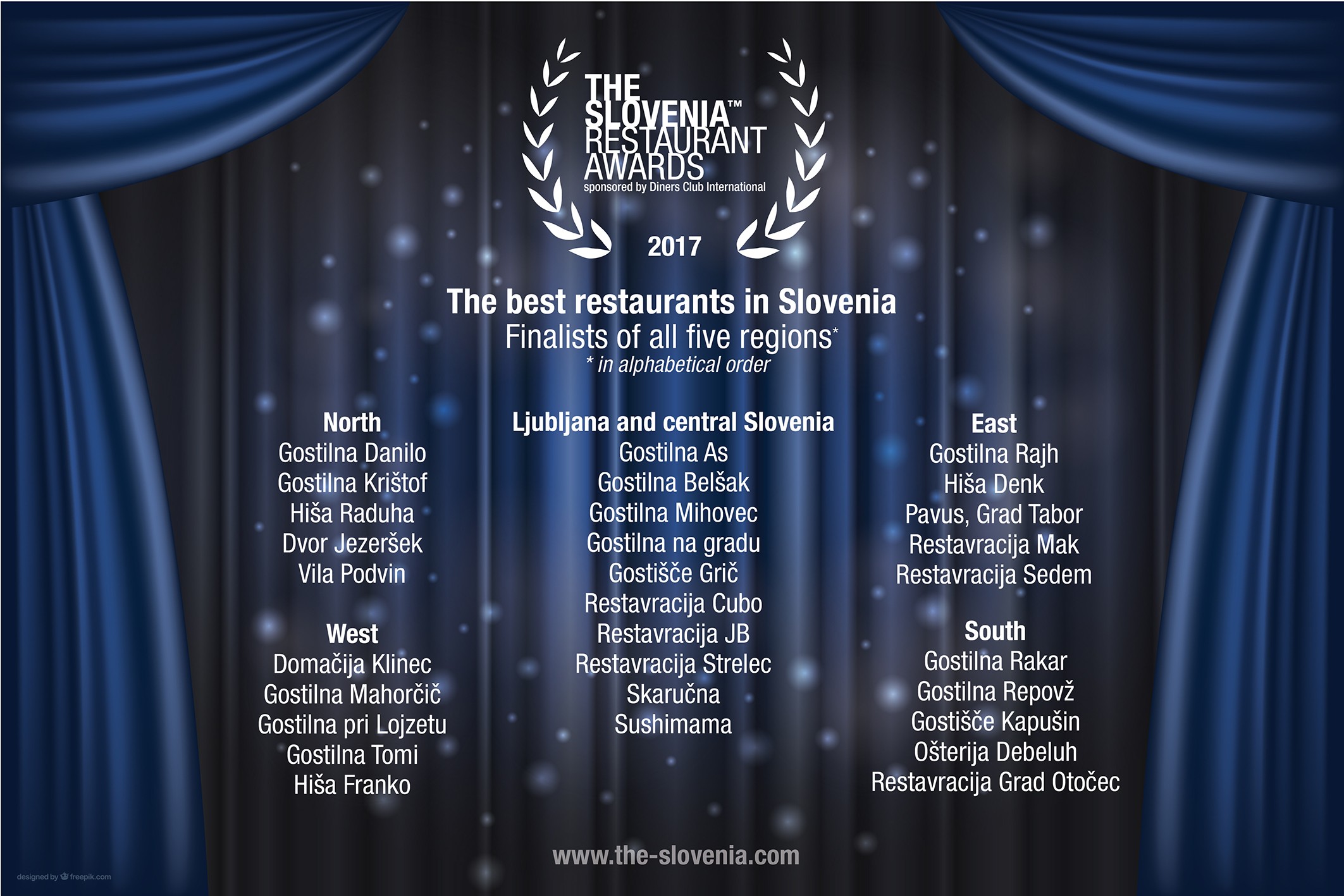 V okviru izbora najboljših restavracij v Sloveniji – The Slovenia Restaurant Awards pod sponzorstvom Diners Cluba za leto 2017 je na Fužinskem gradu v Ljubljani potekala podelitev priznanj in razglasitev regijskih zmagovalcev ter zmagovalca strokovne komisije. V založbi The Slovenia so po nekajmesečnih pripravah strokovne komisije in skoraj dvomesečnem glasovanju Chefs&Foodies Akademije ter ljudstva v naboru 140 predlaganih restavracij dobili finaliste in zmagovalce regije ter zmagovalca po oceni strokovne komisije.