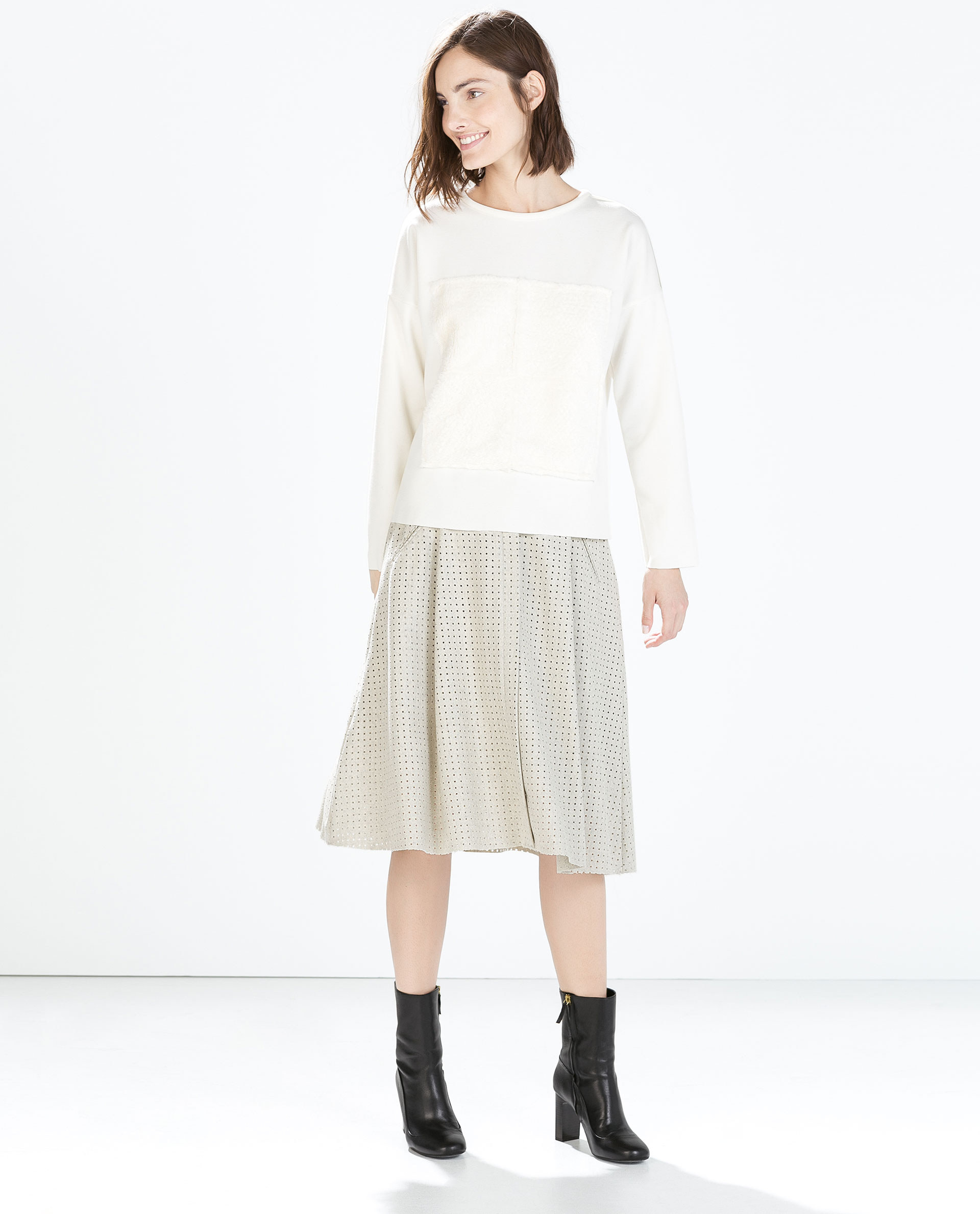 Ko smo razdelali za kakšen namen se bomo oblekli, lahko začnemo izbirati zgornji del. Praviloma je estetka in stilno varna izbira, ko kombiniramo po principu oprijeto-široko. Torej, če je krilo široko krojeno, posezimo po ozkem zgornjem delu in obratno. Za casual priložnosti svoj letošnji najljubši kos garderobe združimo z bombažnim t-shirtom, katerega lahko zataknemo v pas krila bodisi s fino ali široko, voluminozno pletenino. Za bolj fine priložnosti mu privoščimo družbo finega topa ali bluze, lahko tudi ozke, oprijete pletenine s puli ovratnikom. Ni komplicirano, kajne.