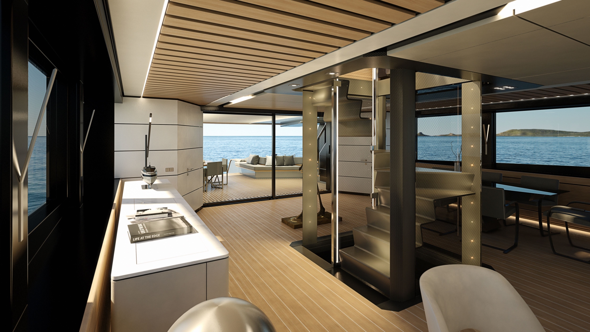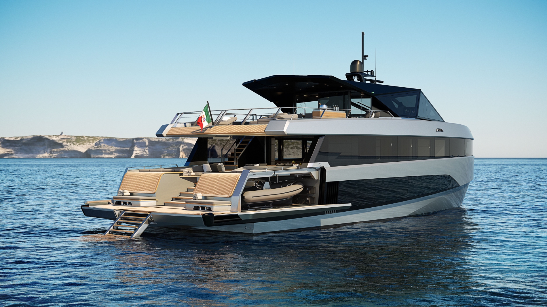 Najrazkošnejši prostor se skriva v premcu in gre seveda za lastnikovo suito. Le ta je z vseh stran obdana z okni in ponuja panoramski razgled na prostrano morje. Na krmi so nameščeni zložljivi deli palube, ki ponujajo dodaten prostor za uživanje na soncu in rekreacijo. V kljunu jahte se nahajata dve veliki garaži, ki ponujata dovolj prostora za kopico vodnih ʺigračʺ. Za pogon skrbijo štirje Volvovi motorji z močjo 588 ali 735 kW, ki poženejo jahto vse do 23 vozlov. Posode za gorivo, v skupni velikosti 12.000 litrov in zalogovnik vode v velikosti 2.200 litrov, omogočata do 390 navtičnih milj dosega in uživanja v luksuzu prestižne jahte.