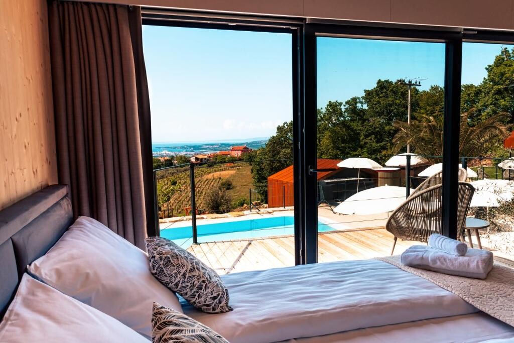 Ta moderna oaza je obdana z vinogradi, oljčnimi nasadi in drugo avtohtono istrsko floro, kar ponuja nepozaben prizor. Harmonična fuzija šika in rustikalnega okolja, skupaj z avtentično istrsko kuhinjo, ustvarja nepozabno izkušnjo z dih jemajočim pogledom na Tržaški zaliv.