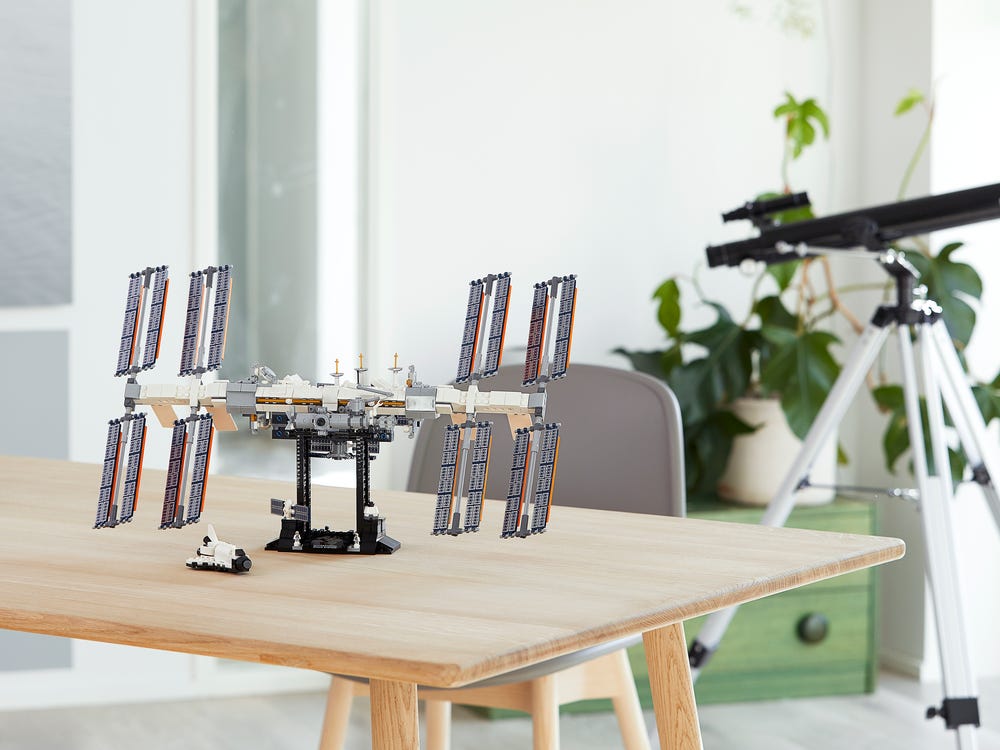 Realistični igralni komplet, ki meri v višino 20 cm, v dolžino 31 cm in v širino 49 cm, ima nameščeno robotsko roko Canadarm2, dve vrtljivi stikališči in osem nastavljivih sončnih panelov. S tem želijo prikazati zapleteno konstrukcijo prave vesoljske postaje, ki kroži nad Zemljo 16-krat na dan. Vsebuje 864 kosov in vključuje vesoljsko raketo NASA s tremi miniaturnimi tovornimi vesoljskimi plovili in dvema mikrofigurama astronavtov. Priložena je tudi ilustrirana knjižica z navodili na 148 straneh, polna zanimivih dejstev in informacij o Mednarodni vesoljski postaji in oboževalcu kock LEGO, Christophu Rugeu, ki je ustvaril izvirno zasnovo za set.