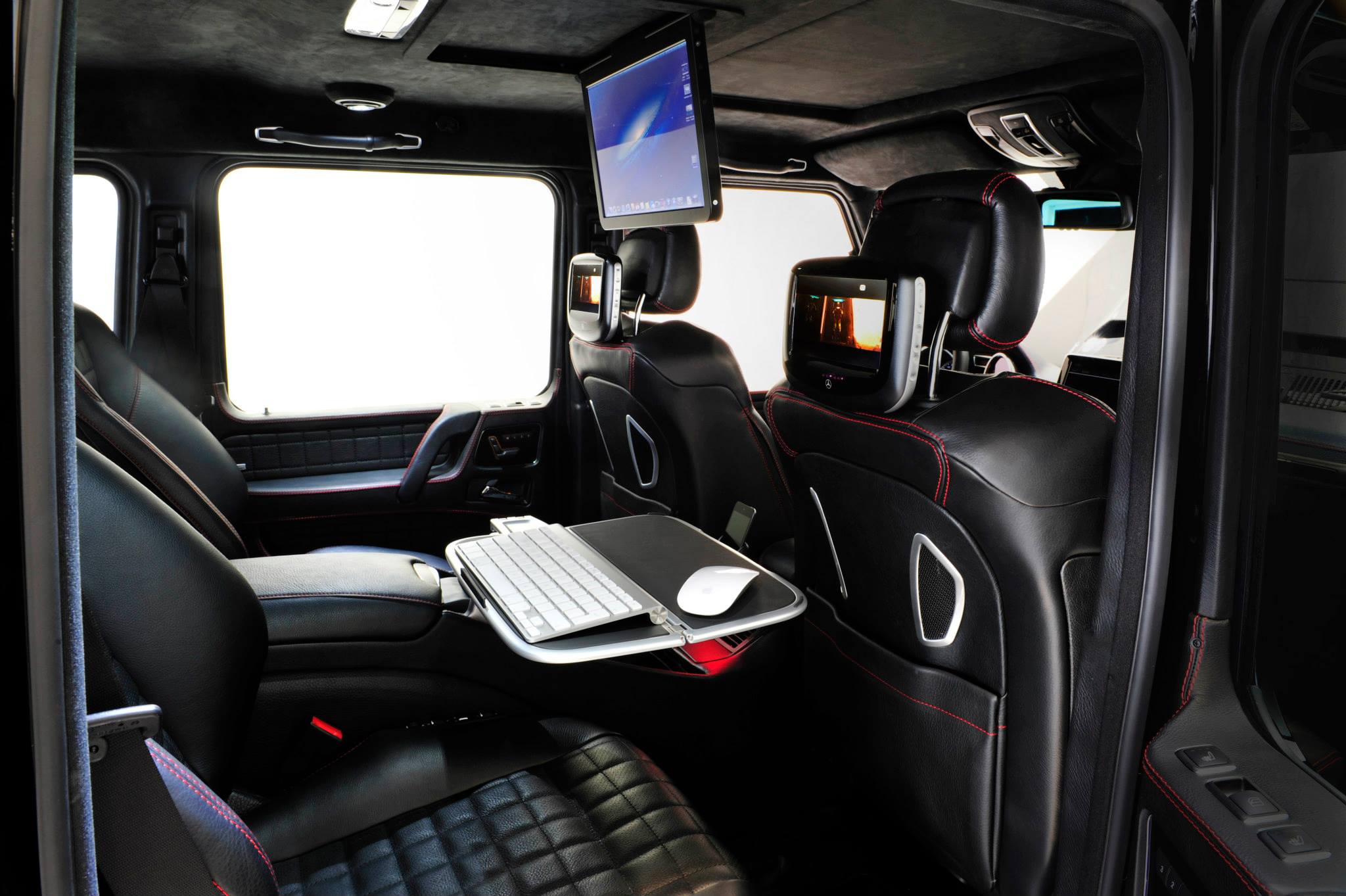 天花板覆盖物 等元素采用了alcantara和皮革的组合装饰,配有非常特别的后排长凳,专门用于工作,是理想的商务环境。当然,还有一个集成的高速调制解调器和 无线局域网,使车辆及其内部始终连接到互联网。