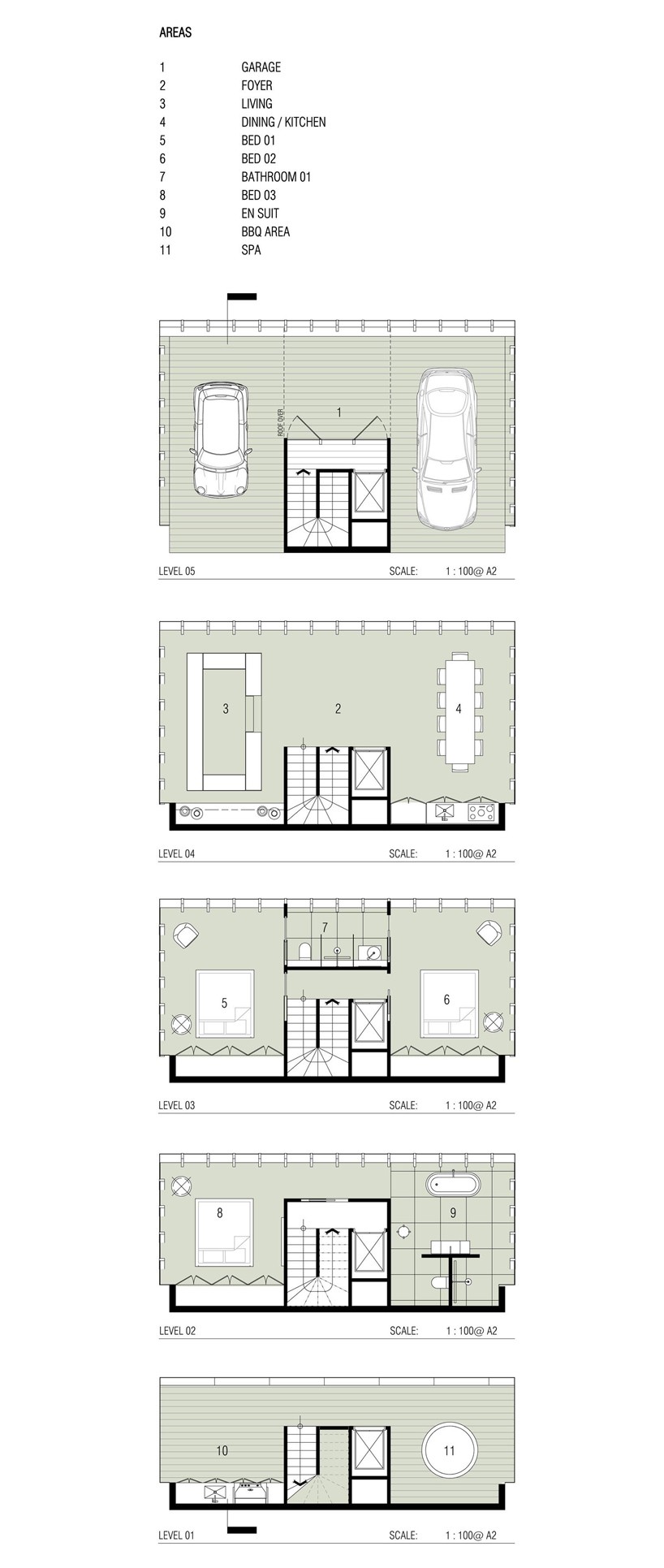 五层 该度假别墅的室内装饰应当简约,以便客人不会忽视海景。大楼将完全被玻璃覆盖,楼层之间的唯一交通方式是乘坐电梯。
