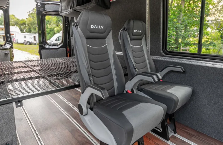 依维柯日用开关 4×4 它配备了模块化系统,可以安装各种生活功能。依维柯与专门生产房车配件的 Hünerkopf 公司合作,提供舒适住宿所需的一切。他们安装了隔热墙壁和地板、两扇滑动侧窗、机舱内的旋转座椅、柴油加热装置和一个带有 130 Ah AGM 电池、充电器、转换器以及用于 12/230 V 和 USB 连接的插座。