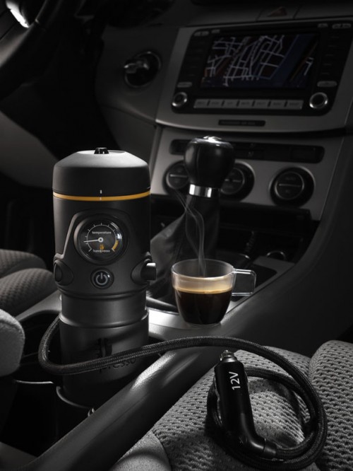 这个很棒 便携式咖啡机 它非常简单且易于使用。将其连接到车内的12V电源,加一点水,按下按钮,等待它用声音信号提醒您饮料准备好了。然后,您只需将设备翻过来并倒入提供的杯子中即可。
