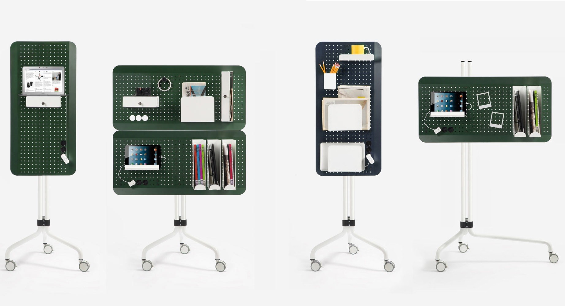 岛屿 由穿孔钢板和可调节管状钢腿制成。这些元件有不同的颜色可供选择,并通过小支架固定在表面上。在工业设计师设计的面板上 乔迪·布拉西,也是一个带有自定义模块的集线器,可以针对电话、HMDI 或 USB 端口进行配置和自定义。